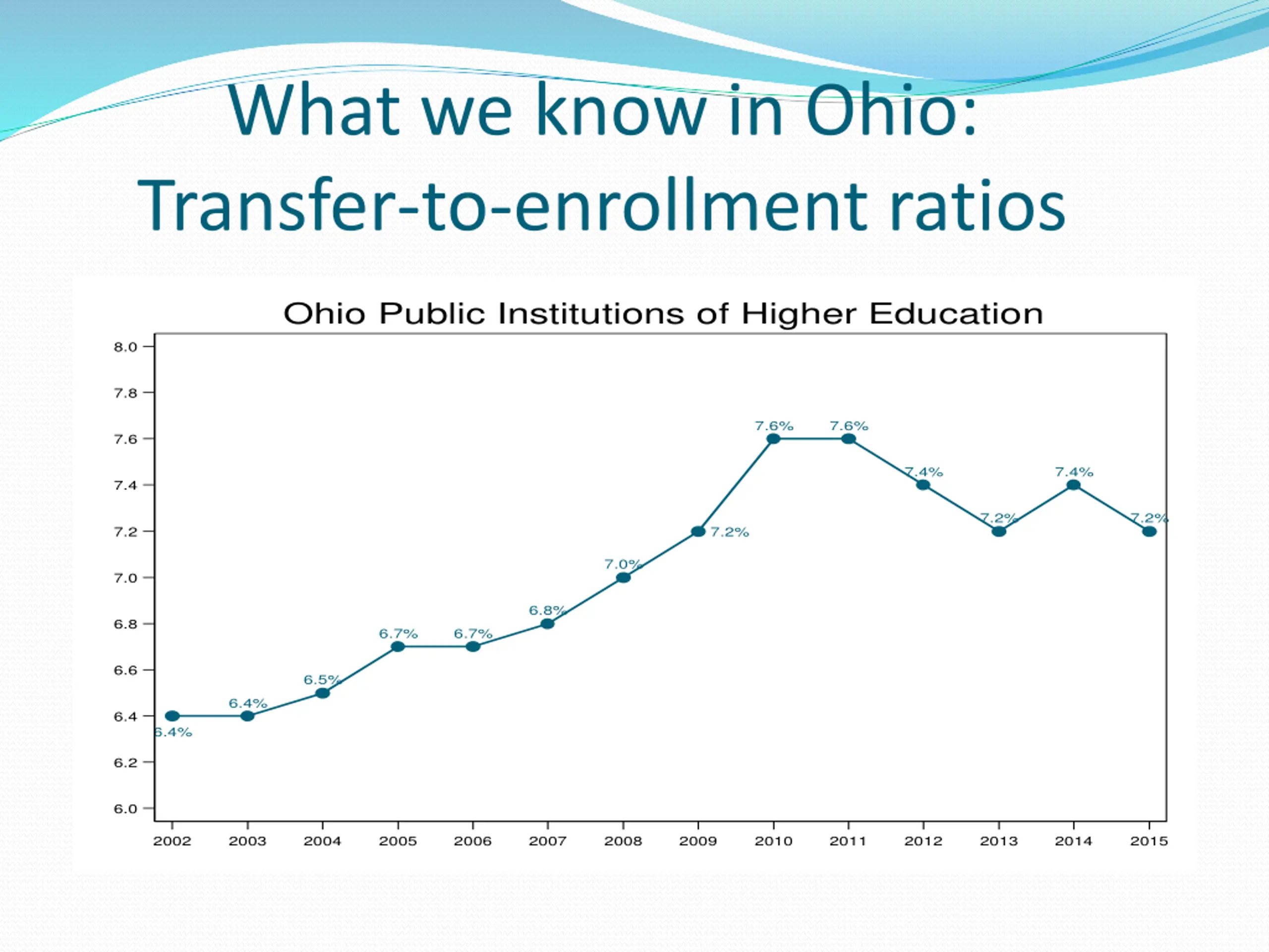 What we know in Ohio: Transfer-to-enrollment ratios Ohio Public Institutions of Higher Education 8.0 7.8 7.6% 7.6% 7.6 7.4% 7.4% 7.4 7.2% 7.2% 7.2 7.2% 7.0% 7.0 6.8% 6.8 6.7% 6.7% 6.6 6.5% 6.4% 6.4 6.4% 6.2 6.0 2002 2003 2004 2005 2006 2007 2008 2009 2010 2011 2012 2013 2014 2015