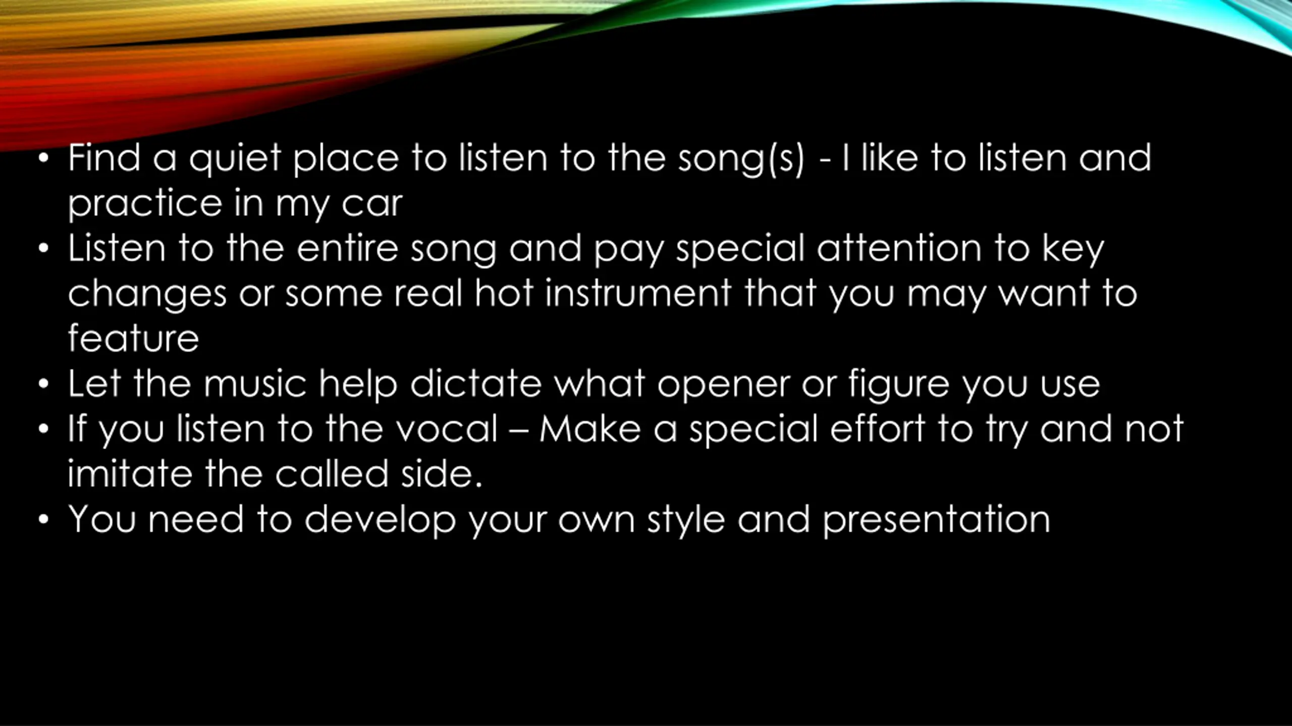 Find a quiet place to listen to the song(s) - I like to listen and practice in my car Listen to the entire song and pay special attention to key changes or some real hot instrument that you may want to feature Let the music help dictate what opener or figure you use If you listen to the vocal Make a special effort to try and not imitate the called side. You need to develop your own style and presentation