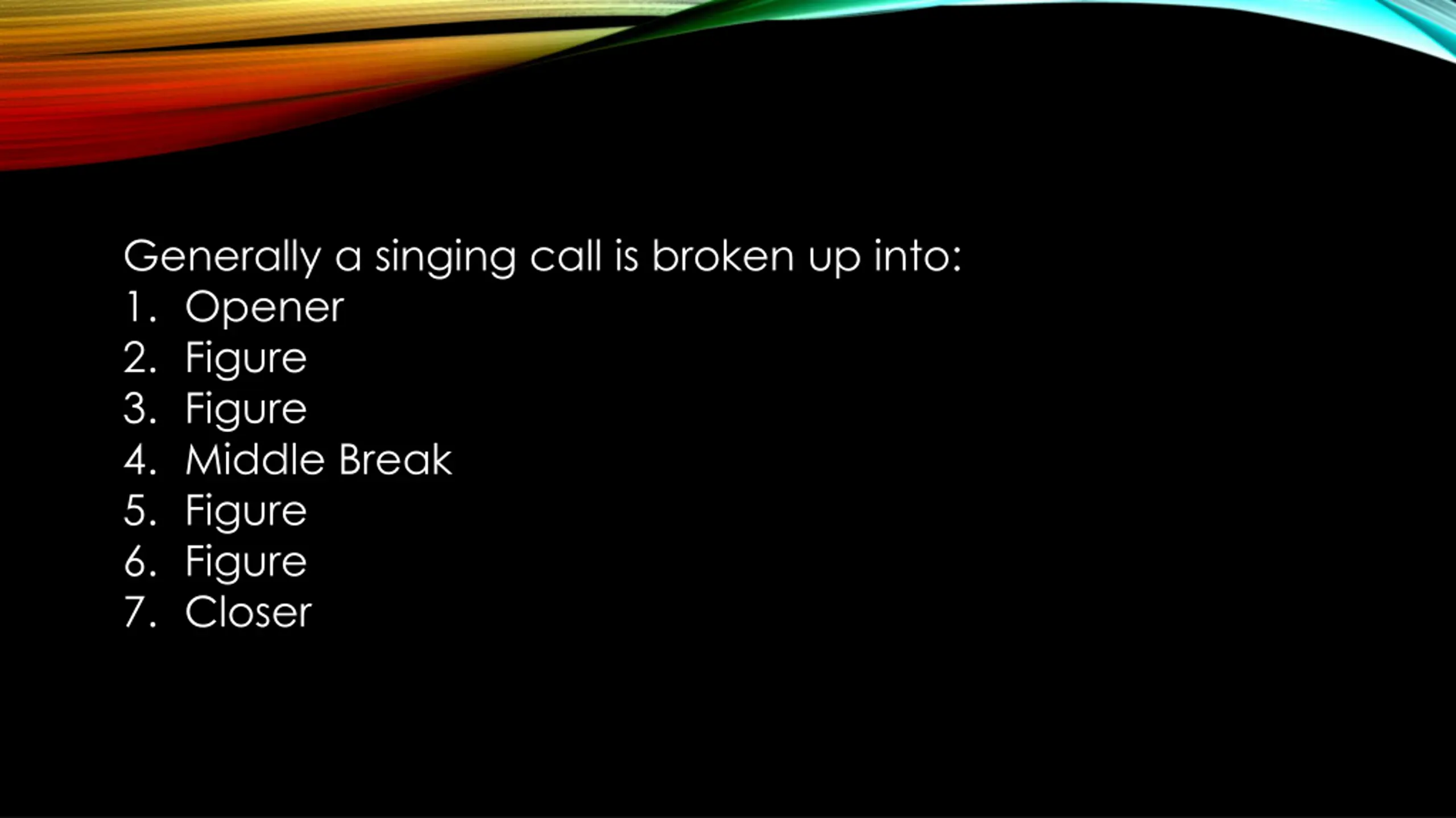 Generally a singing call is broken up into: 1. Opener 2. Figure 3. Figure 4. Middle Break 5. Figure 6. Figure 7. Closer