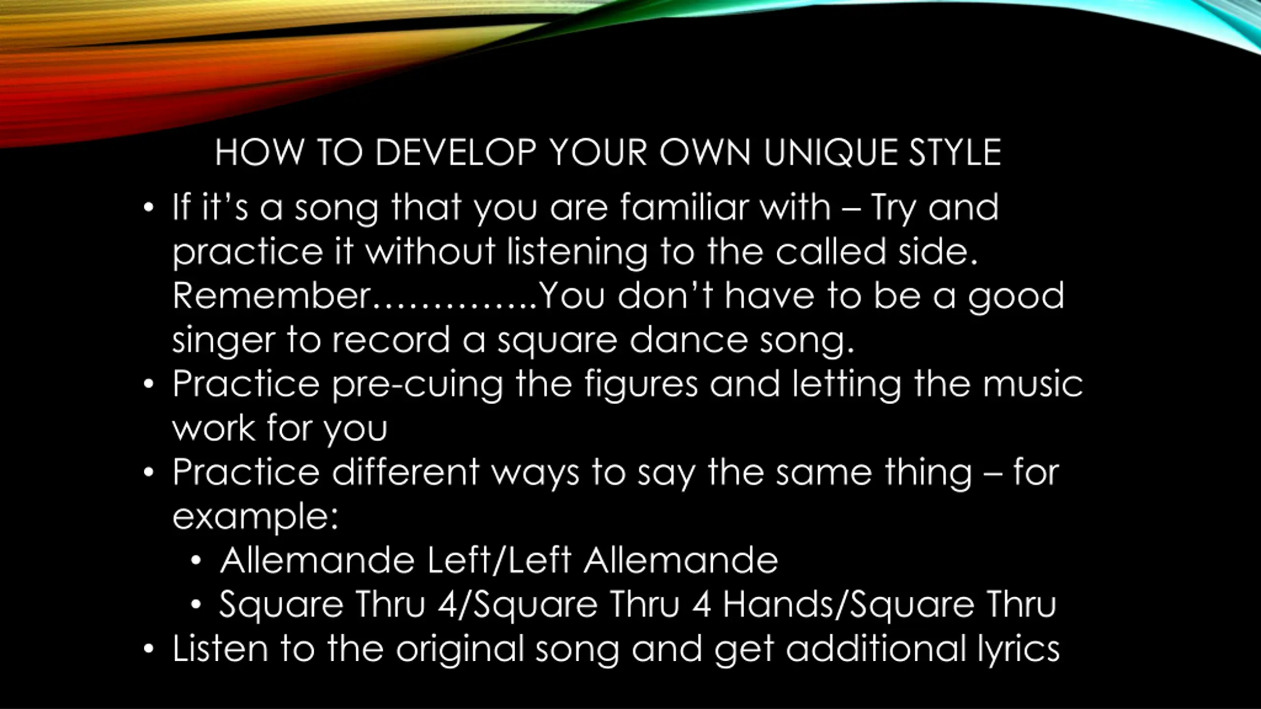 HOW TO DEVELOP YOUR OWN UNIQUE STYLE If it s a song that you are familiar with Try and practice it without listening to the called side. Remember ..You don t have to be a good singer to record a square dance song. Practice pre-cuing the figures and letting the music work for you Practice different ways to say the same thing for example: Allemande Left/Left Allemande Square Thru 4/Square Thru 4 Hands/Square Thru Listen to the original song and get additional lyrics