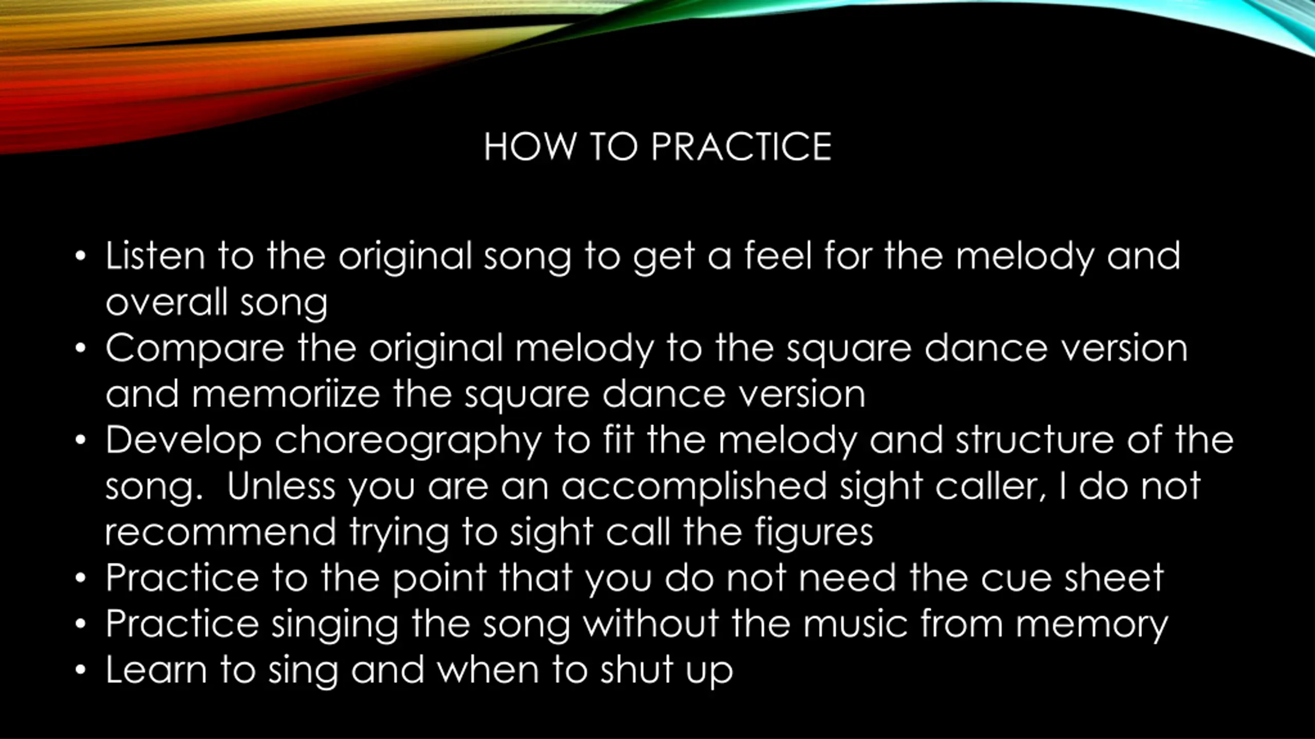 HOW TO PRACTICE Listen to the original song to get a feel for the melody and overall song Compare the original melody to the square dance version and memoriize the square dance version Develop choreography to fit the melody and structure of the song. Unless you are an accomplished sight caller, I do not recommend trying to sight call the figures Practice to the point that you do not need the cue sheet Practice singing the song without the music from memory Learn to sing and when to shut up
