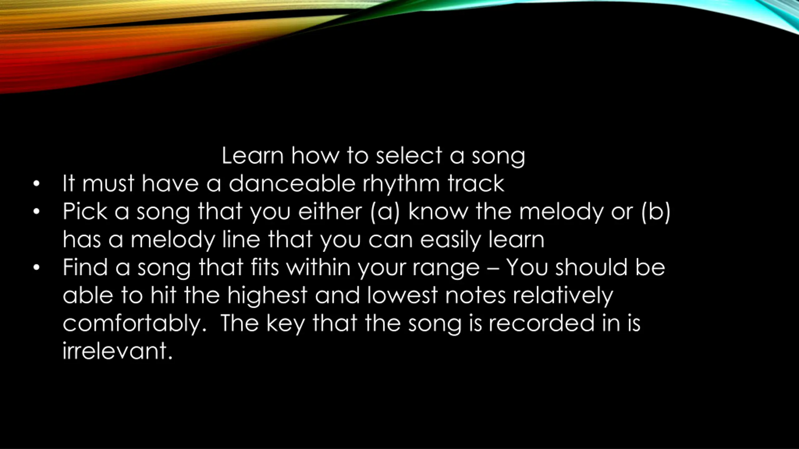 Learn how to select a song It must have a danceable rhythm track Pick a song that you either (a) know the melody or (b) has a melody line that you can easily learn Find a song that fits within your range You should be able to hit the highest and lowest notes relatively comfortably. The key that the song is recorded in is irrelevant.