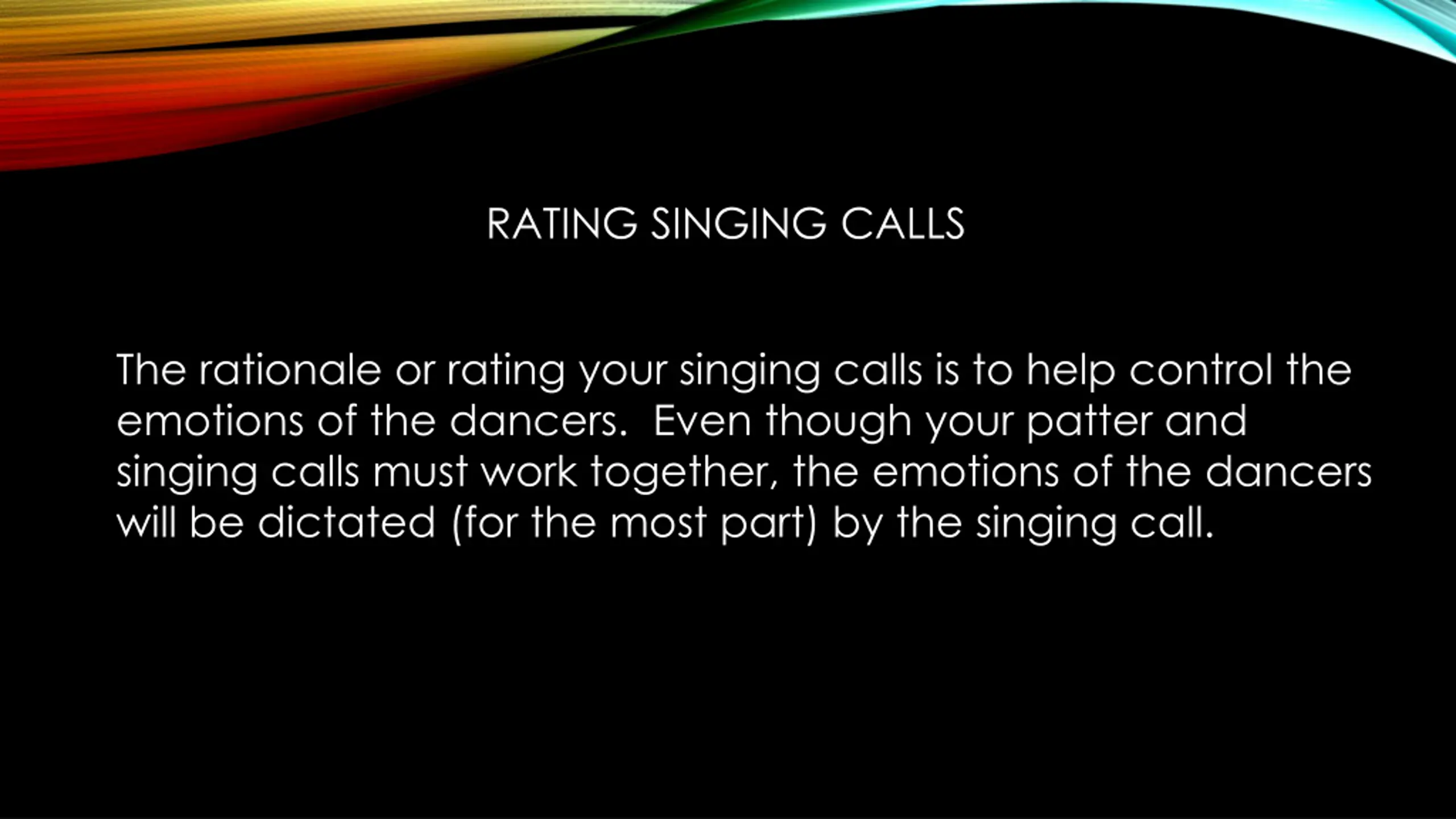 RATING SINGING CALLS The rationale or rating your singing calls is to help control the emotions of the dancers. Even though your patter and singing calls must work together, the emotions of the dancers will be dictated (for the most part) by the singing call.