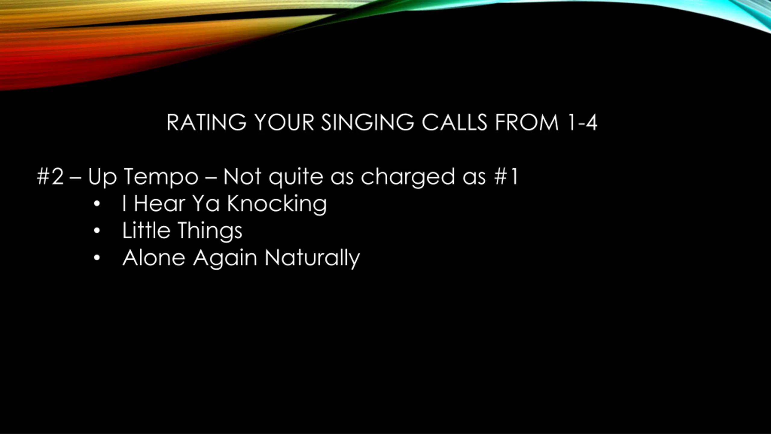 RATING YOUR SINGING CALLS FROM 1-4 #2 Up Tempo Not quite as charged as #1 I Hear Ya Knocking Little Things Alone Again Naturally