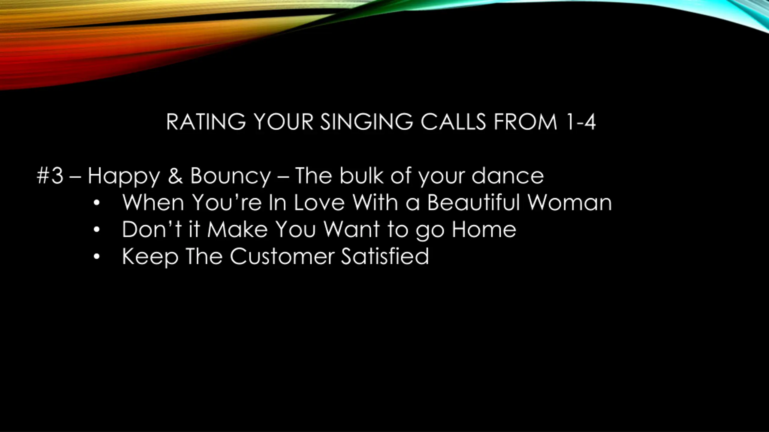 RATING YOUR SINGING CALLS FROM 1-4 #3 Happy & Bouncy The bulk of your dance When You re In Love With a Beautiful Woman Don t it Make You Want to go Home Keep The Customer Satisfied