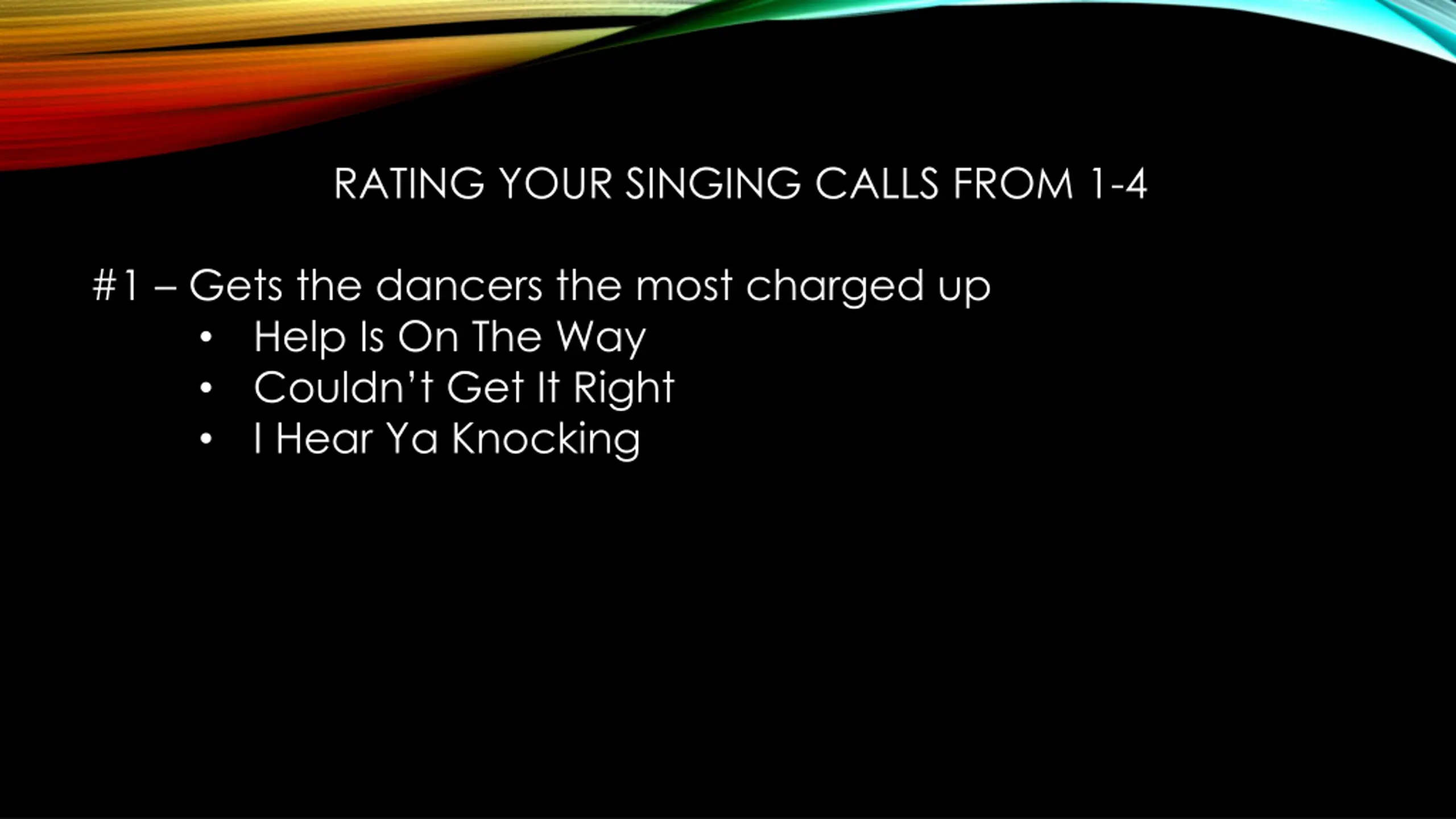 RATING YOUR SINGING CALLS FROM 1-4 #1 Gets the dancers the most charged up Help Is On The Way Couldn t Get It Right I Hear Ya Knocking