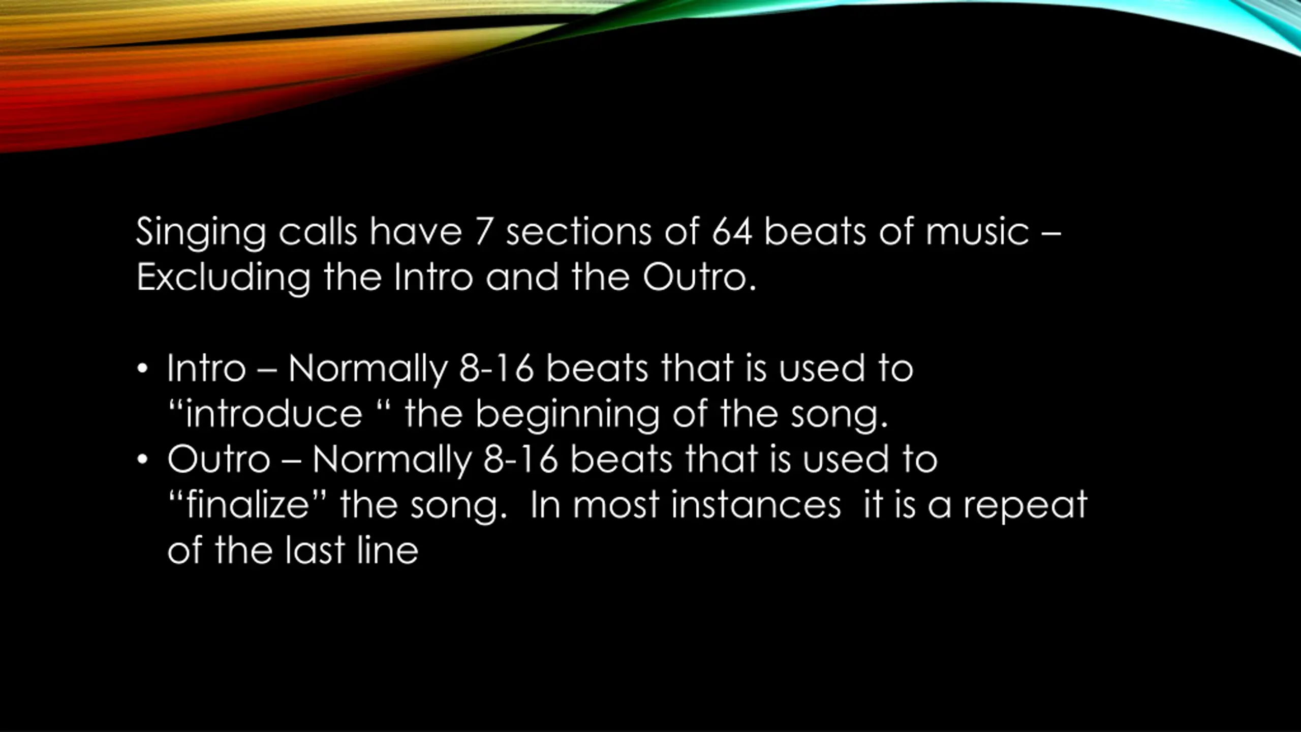 Singing calls have 7 sections of 64 beats of music Excluding the Intro and the Outro. Intro Normally 8-16 beats that is used to introduce the beginning of the song. Outro Normally 8-16 beats that is used to finalize the song. In most instances it is a repeat of the last line