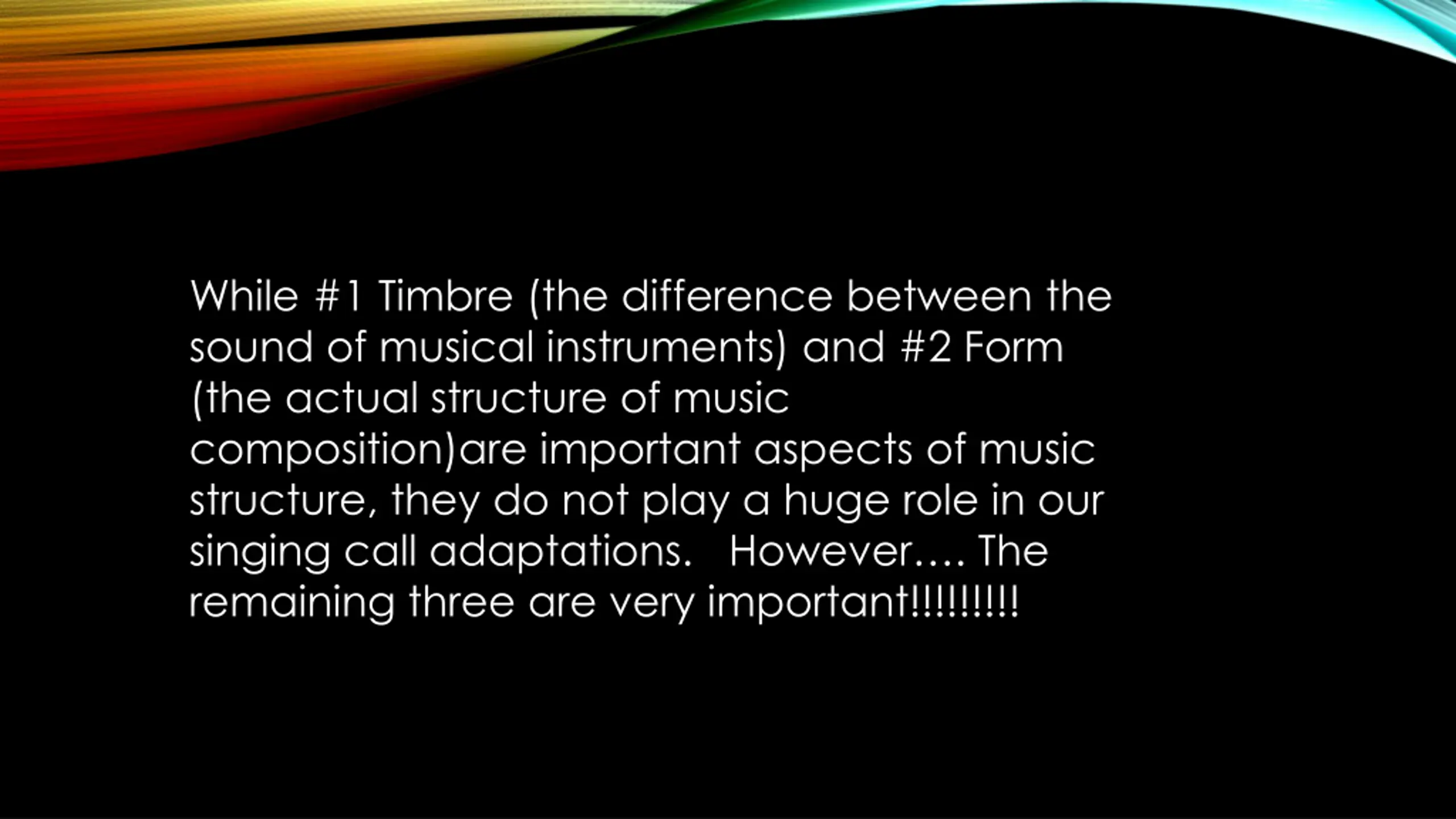 While #1 Timbre (the difference between the sound of musical instruments) and #2 Form (the actual structure of music composition)are important aspects of music structure, they do not play a huge role in our singing call adaptations. However . The remaining three are very important!!!!!!!!!
