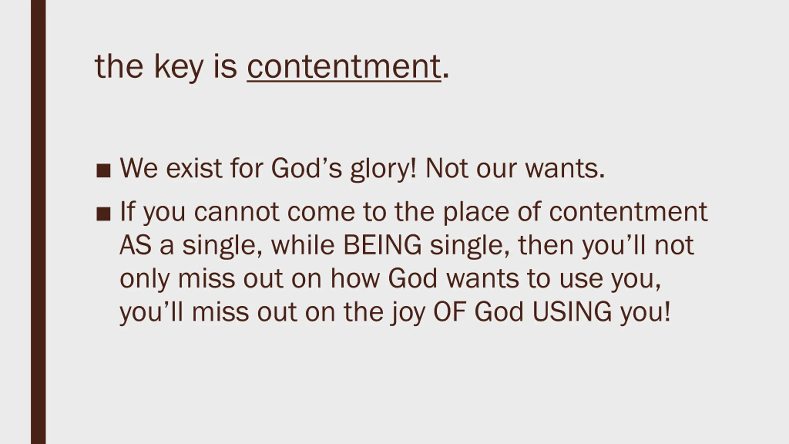 the key is contentment. We exist for God s glory! Not our wants. If you cannot come to the place of contentment AS a single, while BEING single, then you ll not only miss out on how God wants to use you, you ll miss out on the joy OF God USING you!