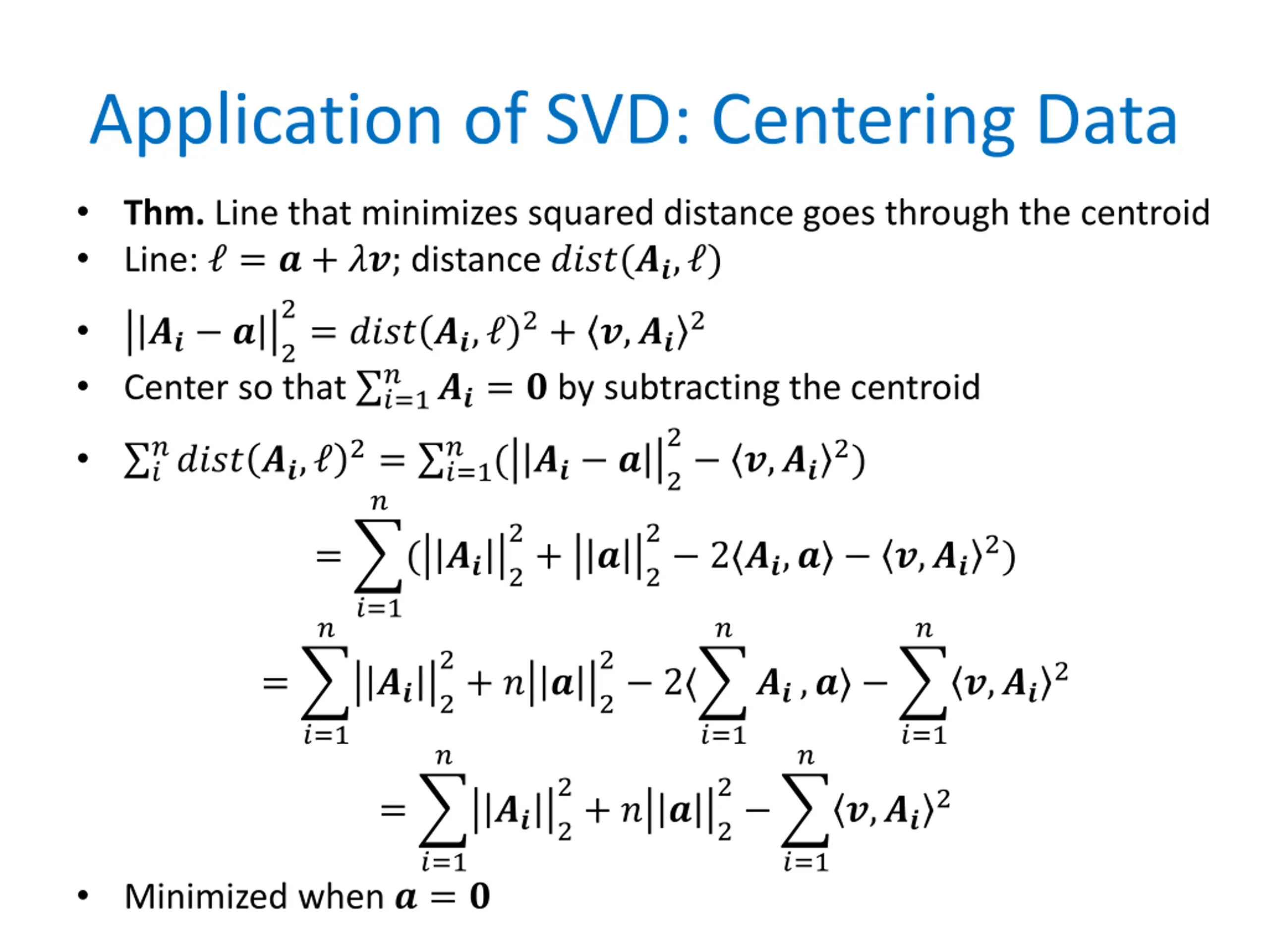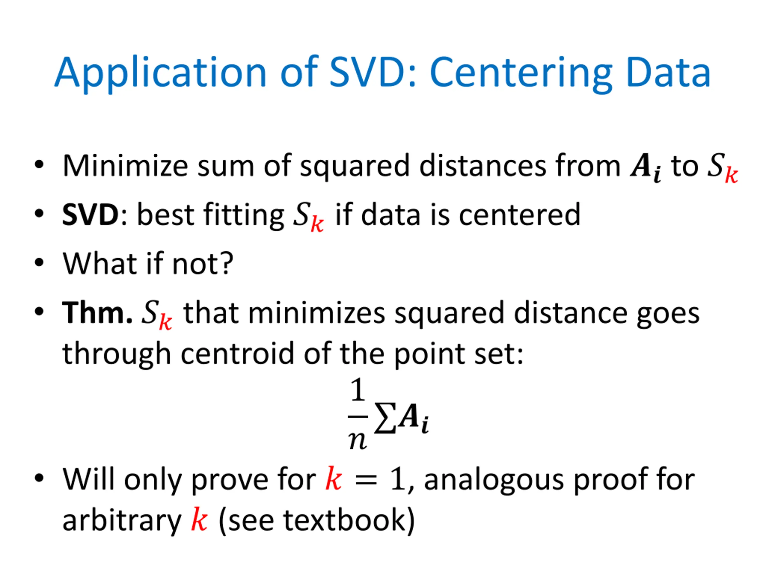 Application of SVD: Centering Data Minimize sum of squared distances from ?? to ?? SVD: best fitting ?? if data is centered What if not? Thm. ?? that minimizes squared distance goes through centroid of the point set: 1 ? ?? Will only prove for? = 1, analogous proof for arbitrary ? (see textbook)