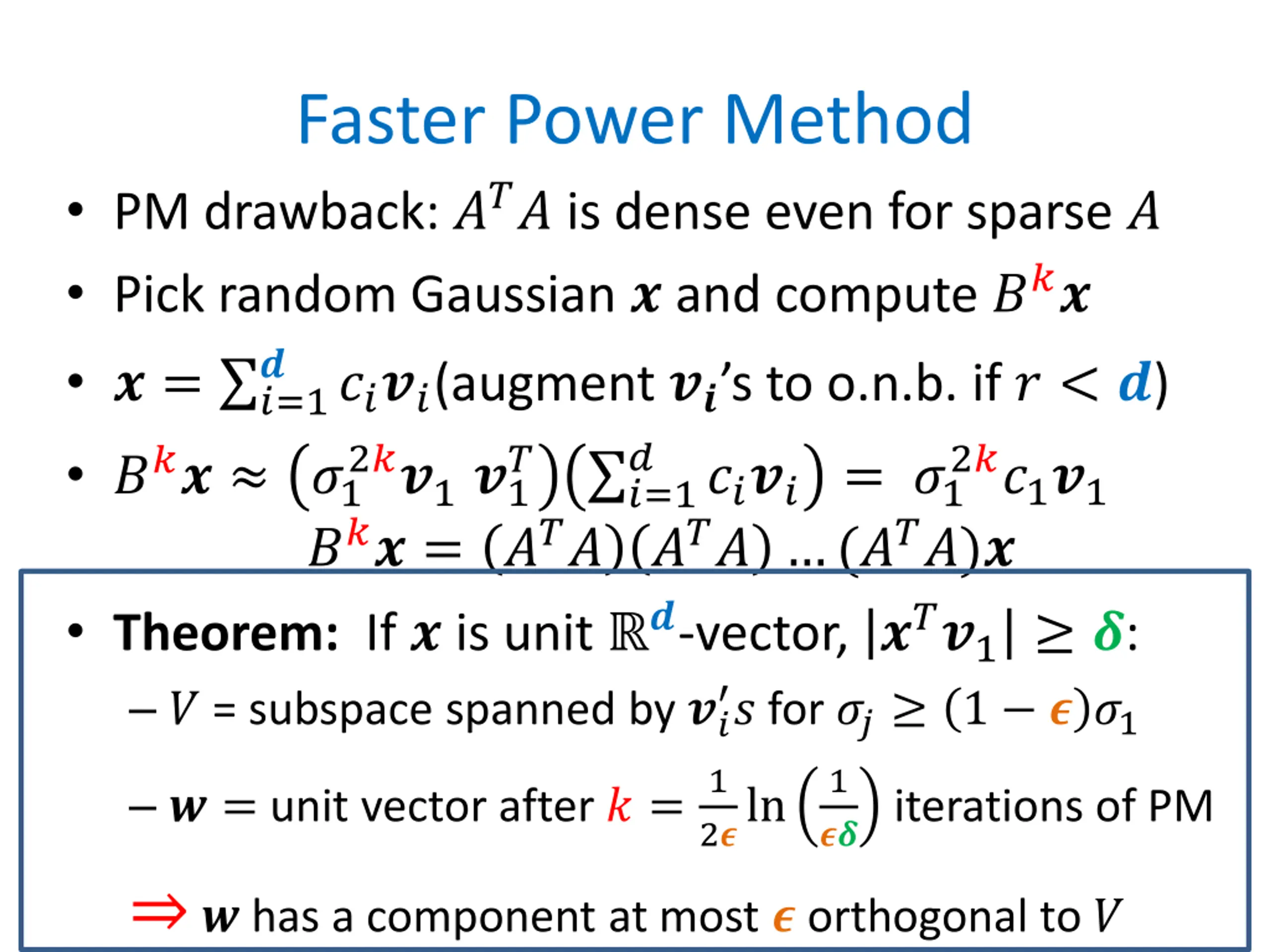 Faster Power Method PM drawback: ??? is dense even for sparse ? Pick random Gaussian ?and compute ??? ? = ?=1 ????(augment ?? s to o.n.b. if ? < ?) ??? ?1 ?=1 ??? = ??? ??? (???)? Theorem: If?is unit ?-vector, ???1 ?: ? = subspace spanned by ?? ? ? 2??1?1 2??1?1 ? ???? = ?1 ? for ?? 1 ? ?1 1 2?ln 1 ?? iterations of PM ? =unit vector after ? = ? has a component at most ? orthogonal to ?
