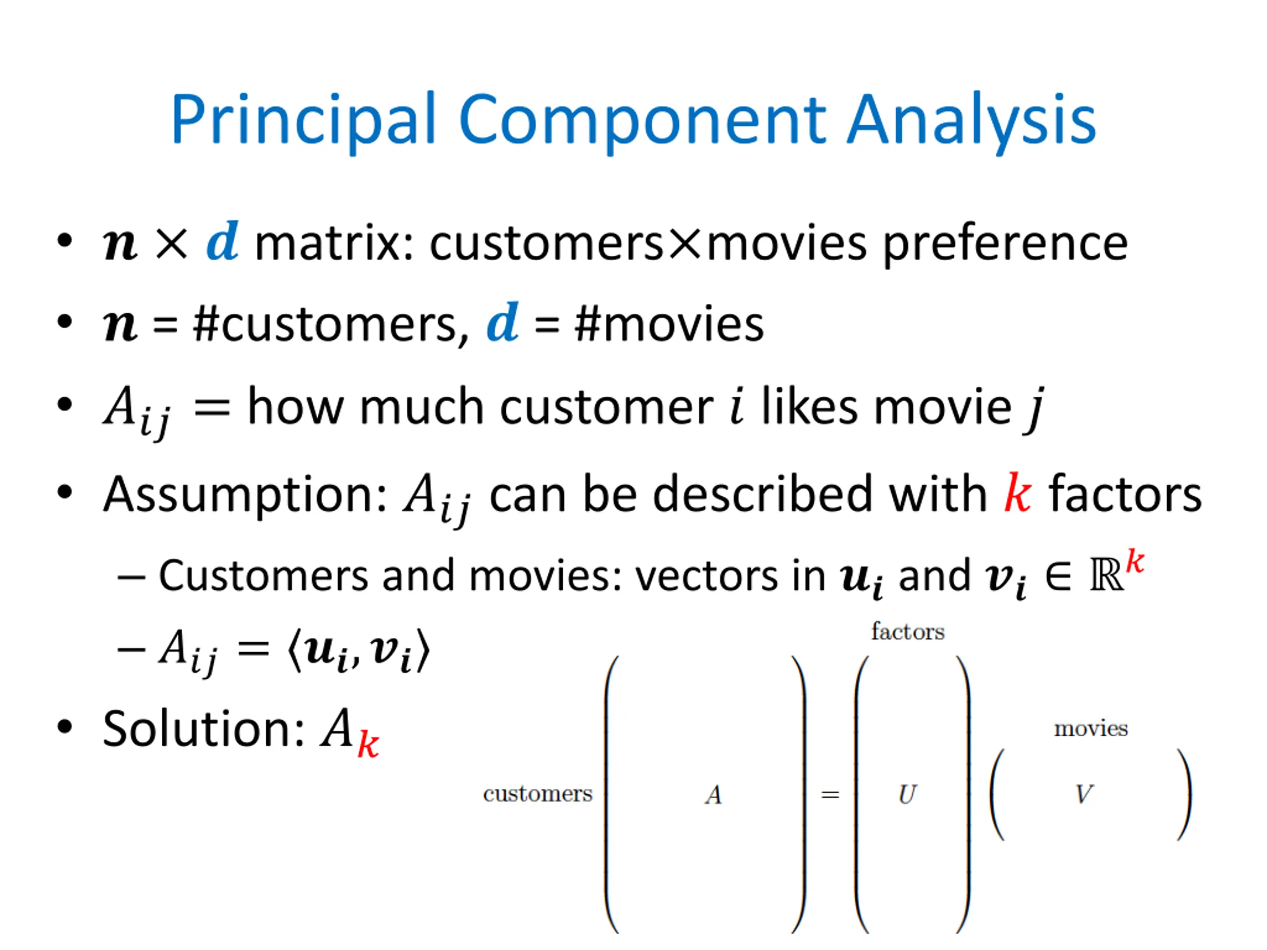 Principal Component Analysis ? ? matrix: customers movies preference ? = #customers, ? = #movies ???= how much customer ? likes movie ? Assumption: ??? can be described with ? factors Customers and movies: vectors in ??and?? ? ???= ??,?? Solution: ??