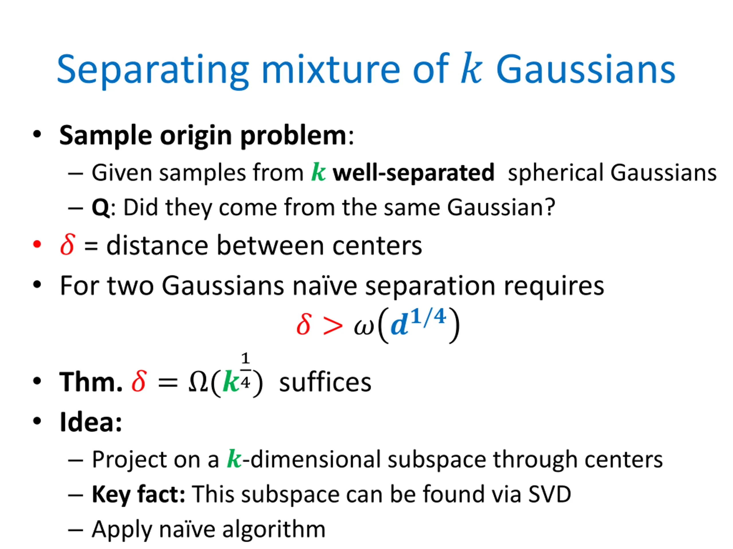 Separating mixture of ? Gaussians Sample origin problem: Given samples from ? well-separated spherical Gaussians Q: Did they come from the same Gaussian? ? = distance between centers For two Gaussians na ve separation requires ? > ? ??/? 1 4) suffices Idea: Project on a ?-dimensional subspace through centers Key fact: This subspace can be found via SVD Apply na ve algorithm Thm. ? = (?