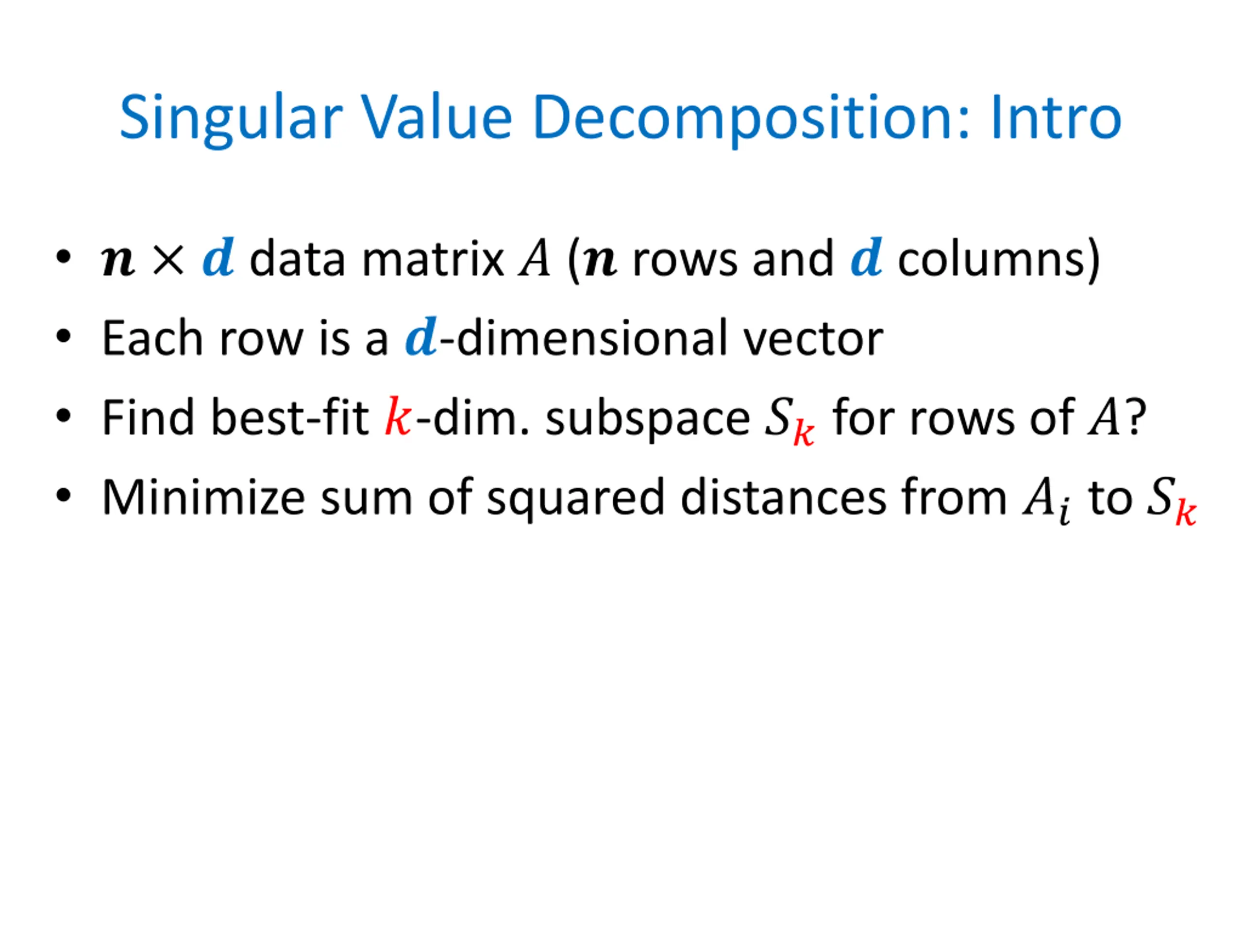 Singular Value Decomposition: Intro ? ? data matrix ? (? rows and ? columns) Each row is a ?-dimensional vector Find best-fit ?-dim. subspace ?? for rows of ?? Minimize sum of squared distances from ?? to ??