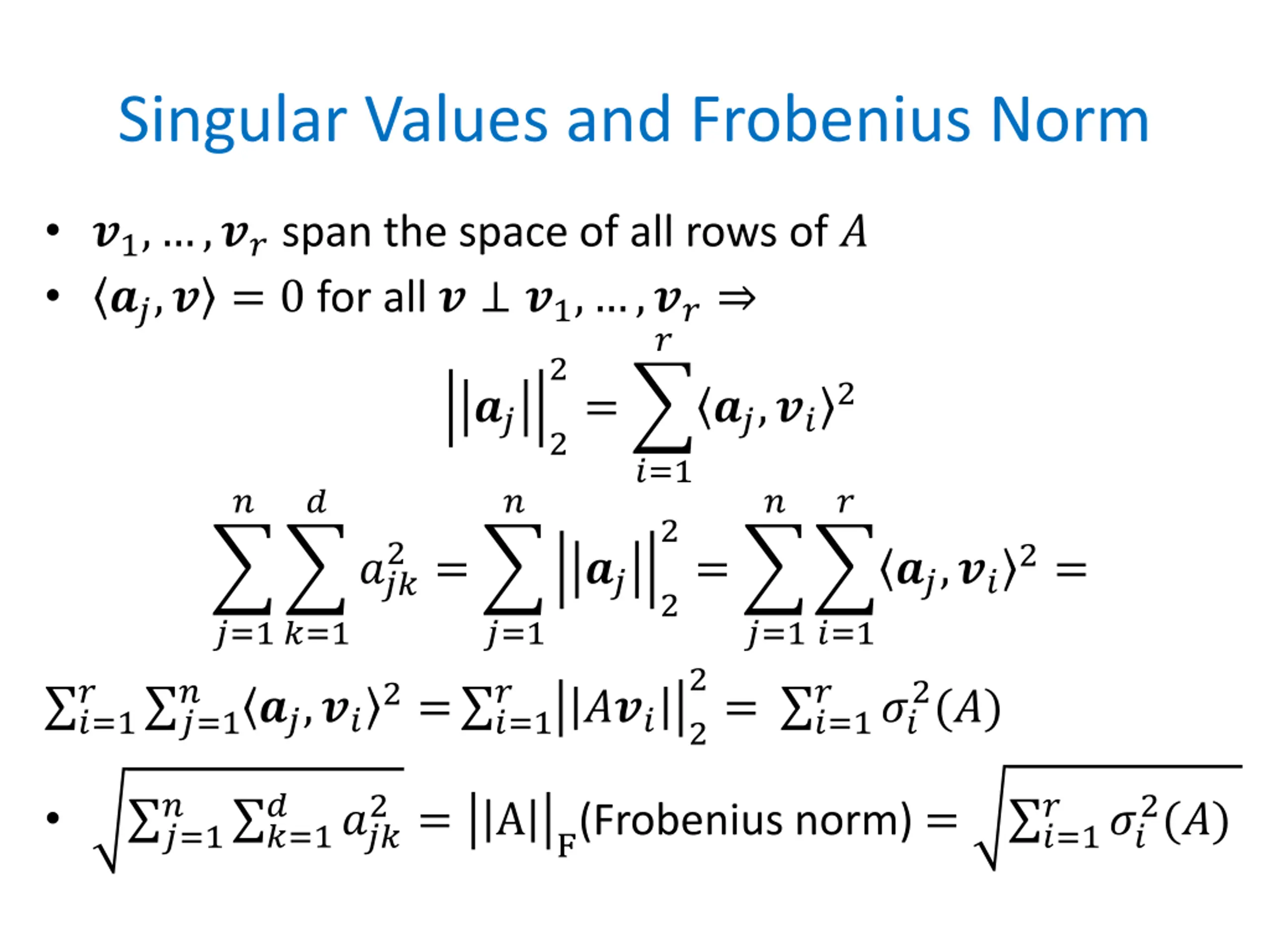 Singular Values and Frobenius Norm ?1, ,?? span the space of all rows of ? ??,? = 0 for all ? ?1, ,?? ? 2 2 ?? = ??,?? 2 ?=1 ? ? ? ? ? 2 2= 2= ??? ?? = ??,?? 2 ?=1 ?=1 ?=1 ?=1 ?=1 2= ?=1 ? ? ? ? 2(?) 2= ?=1 ?=1 ?=1 ??,?? ??? ?? 2 ? ? 2= ? 2(?) ?=1 ?=1 ?=1 ??? A F(Frobenius norm) = ??