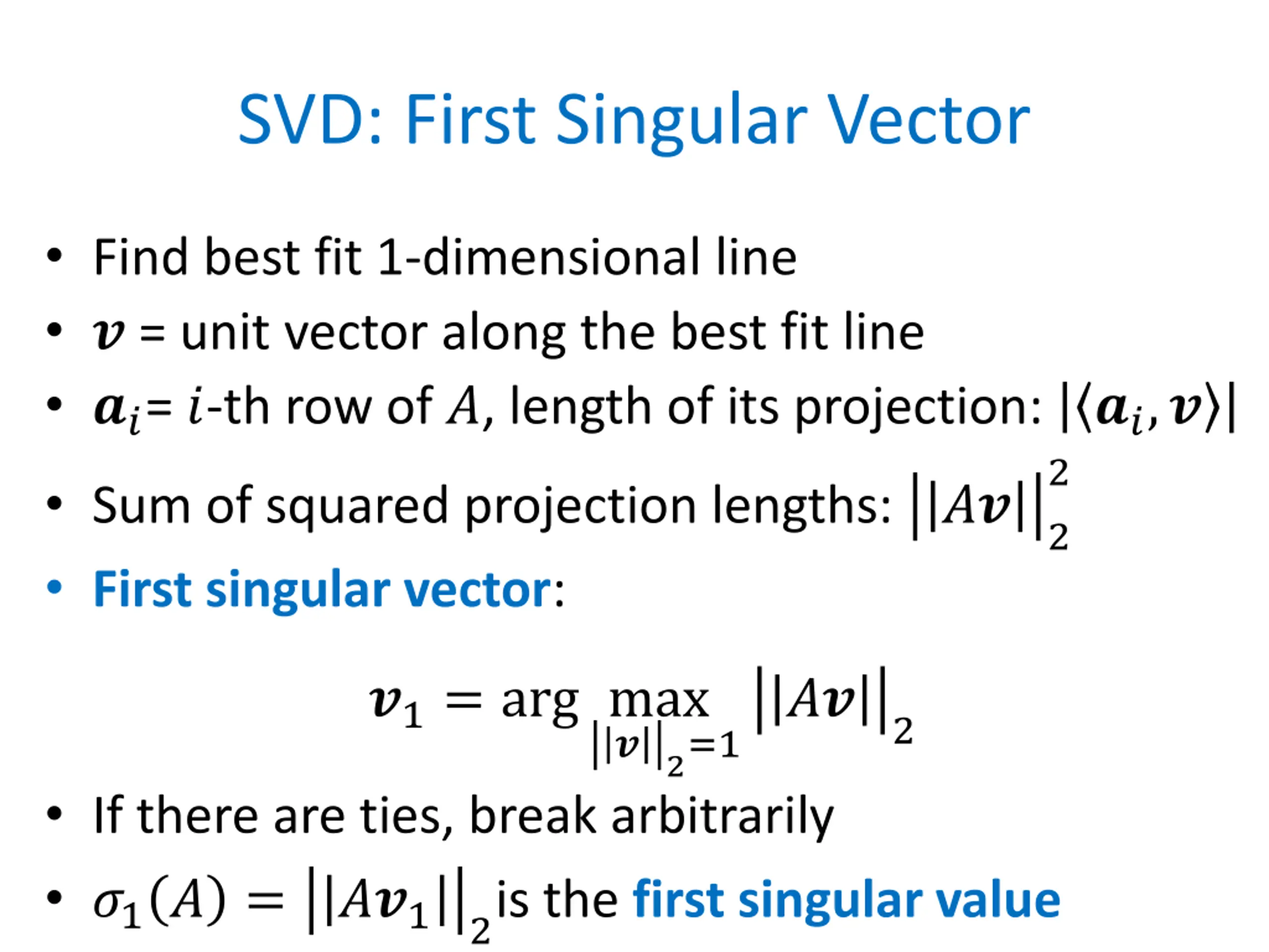 SVD: First Singular Vector Find best fit 1-dimensional line ? = unit vector along the best fit line ??= ?-th row of ?, length of its projection: ??,? Sum of squared projection lengths: ?? First singular vector: 2 2 ?1= arg max ?? 2 ? 2=1 If there are ties, break arbitrarily ?1? = ??1 2is the first singular value