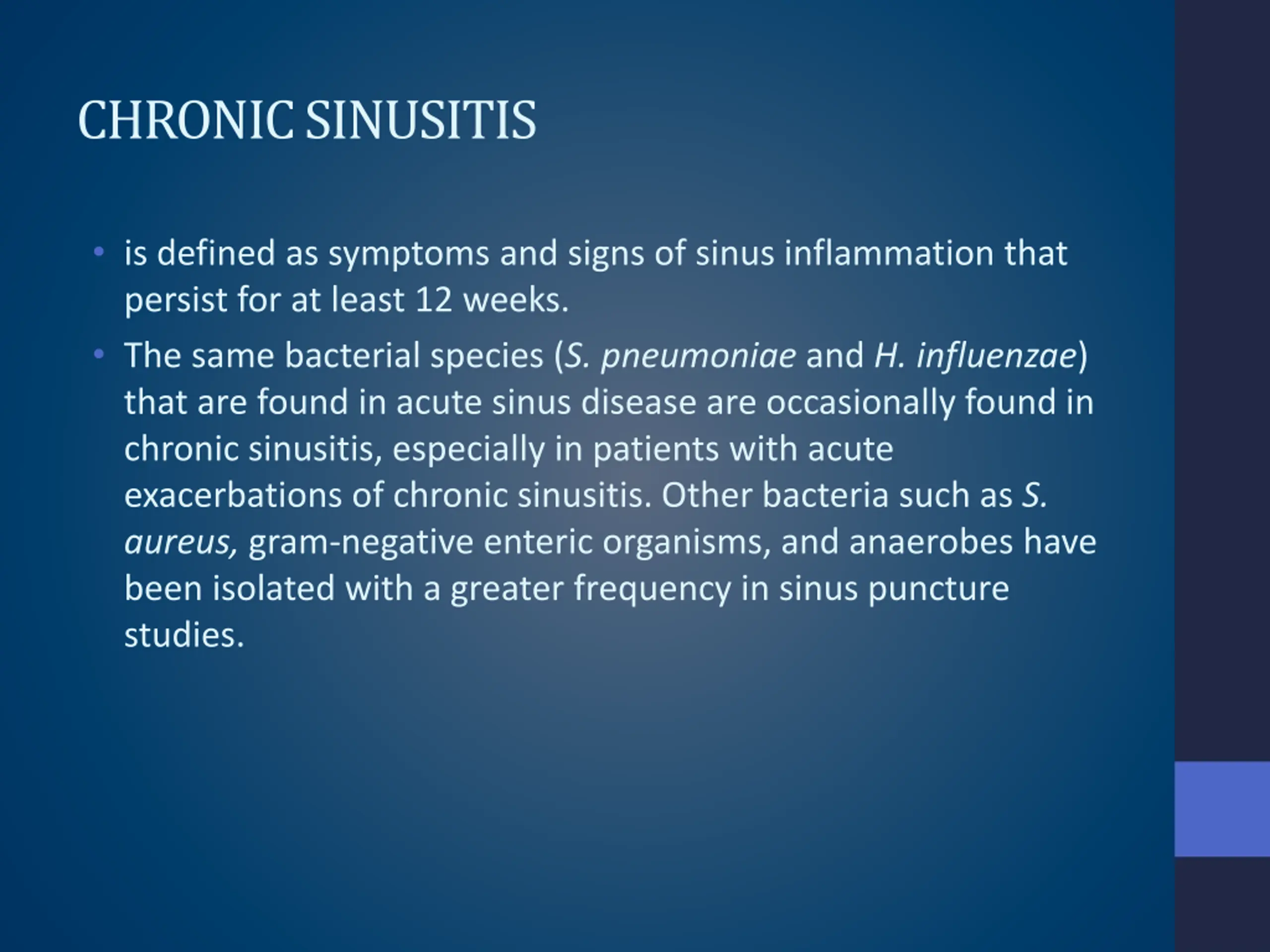 CHRONIC SINUSITIS is defined as symptoms and signs of sinus inflammation that persist for at least 12 weeks. The same bacterial species (S. pneumoniae and H. influenzae) that are found in acute sinus disease are occasionally found in chronic sinusitis, especially in patients with acute exacerbations of chronic sinusitis. Other bacteria such as S. aureus, gram-negative enteric organisms, and anaerobes have been isolated with a greater frequency in sinus puncture studies.