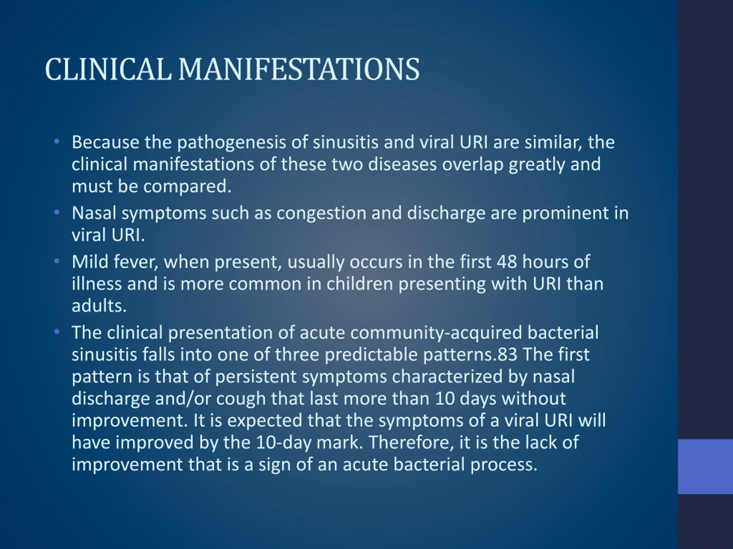 CLINICAL MANIFESTATIONS Because the pathogenesis of sinusitis and viral URI are similar, the clinical manifestations of these two diseases overlap greatly and must be compared. Nasal symptoms such as congestion and discharge are prominent in viral URI. Mild fever, when present, usually occurs in the first 48 hours of illness and is more common in children presenting with URI than adults. The clinical presentation of acute community-acquired bacterial sinusitis falls into one of three predictable patterns.83 The first pattern is that of persistent symptoms characterized by nasal discharge and/or cough that last more than 10 days without improvement. It is expected that the symptoms of a viral URI will have improved by the 10-day mark. Therefore, it is the lack of improvement that is a sign of an acute bacterial process.