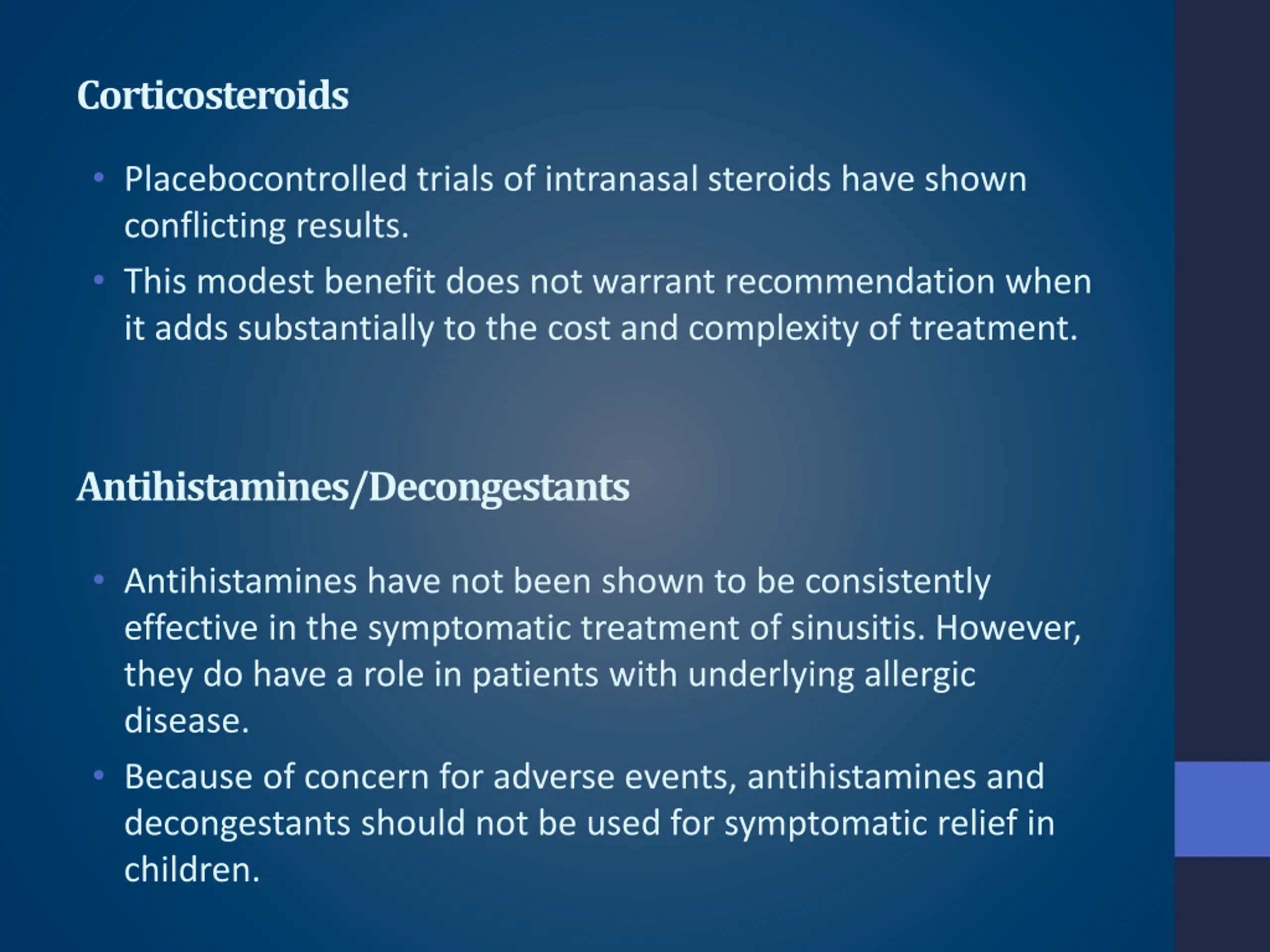 Corticosteroids Placebocontrolled trials of intranasal steroids have shown conflicting results. This modest benefit does not warrant recommendation when it adds substantially to the cost and complexity of treatment. Antihistamines/Decongestants Antihistamines have not been shown to be consistently effective in the symptomatic treatment of sinusitis. However, they do have a role in patients with underlying allergic disease. Because of concern for adverse events, antihistamines and decongestants should not be used for symptomatic relief in children.