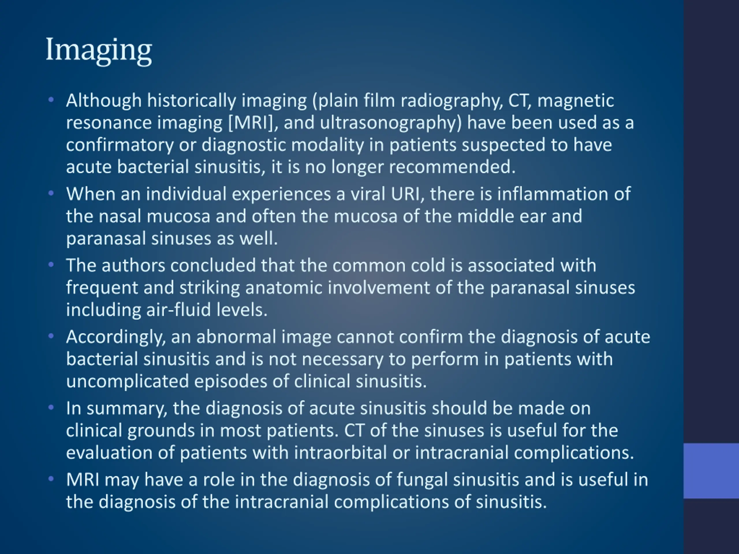 Imaging Although historically imaging (plain film radiography, CT, magnetic resonance imaging [MRI], and ultrasonography) have been used as a confirmatory or diagnostic modality in patients suspected to have acute bacterial sinusitis, it is no longer recommended. When an individual experiences a viral URI, there is inflammation of the nasal mucosa and often the mucosa of the middle ear and paranasal sinuses as well. The authors concluded that the common cold is associated with frequent and striking anatomic involvement of the paranasal sinuses including air-fluid levels. Accordingly, an abnormal image cannot confirm the diagnosis of acute bacterial sinusitis and is not necessary to perform in patients with uncomplicated episodes of clinical sinusitis. In summary, the diagnosis of acute sinusitis should be made on clinical grounds in most patients. CT of the sinuses is useful for the evaluation of patients with intraorbital or intracranial complications. MRI may have a role in the diagnosis of fungal sinusitis and is useful in the diagnosis of the intracranial complications of sinusitis.