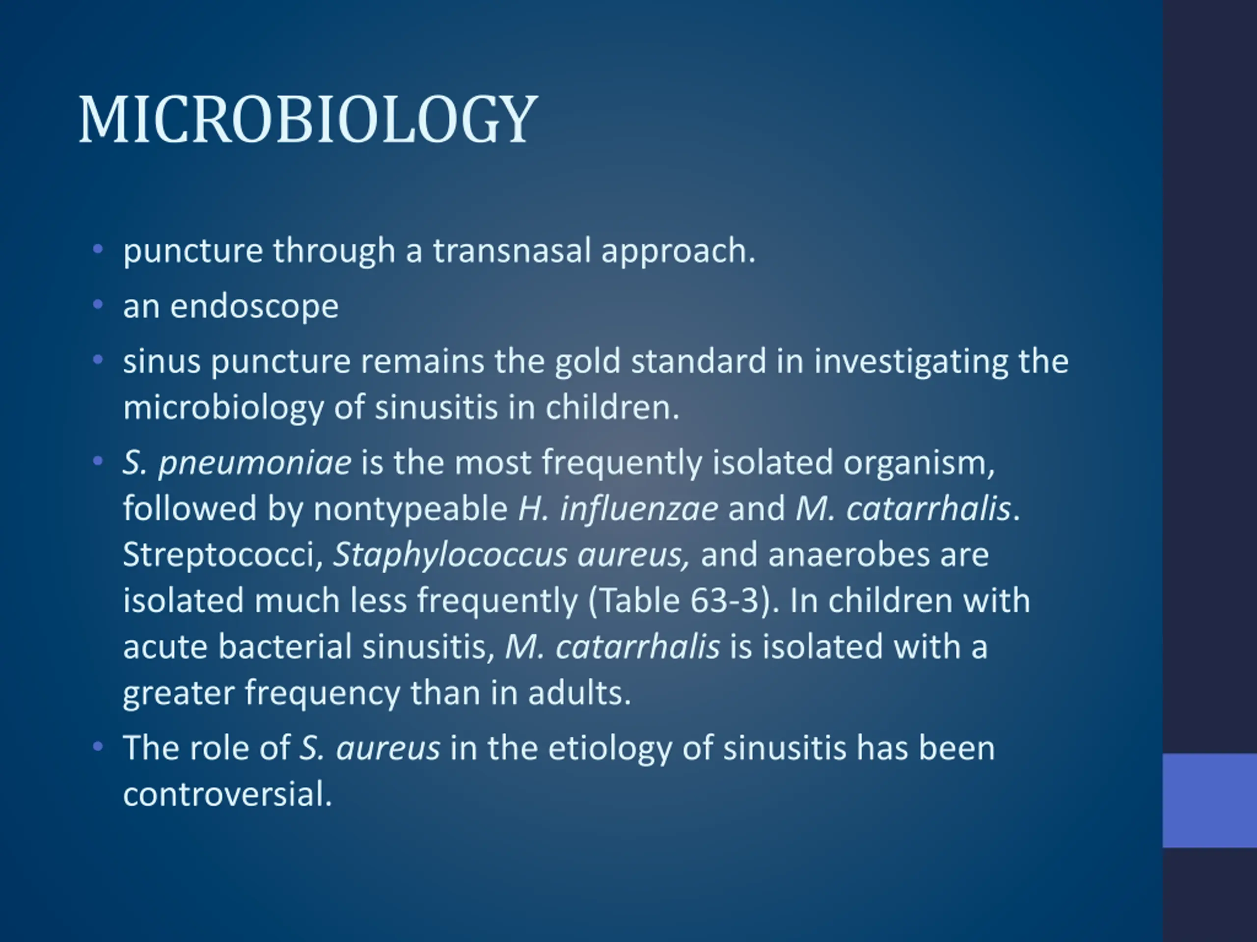 MICROBIOLOGY puncture through a transnasal approach. an endoscope sinus puncture remains the gold standard in investigating the microbiology of sinusitis in children. S. pneumoniae is the most frequently isolated organism, followed by nontypeable H. influenzae and M. catarrhalis. Streptococci, Staphylococcus aureus, and anaerobes are isolated much less frequently (Table 63-3). In children with acute bacterial sinusitis, M. catarrhalis is isolated with a greater frequency than in adults. The role of S. aureus in the etiology of sinusitis has been controversial.