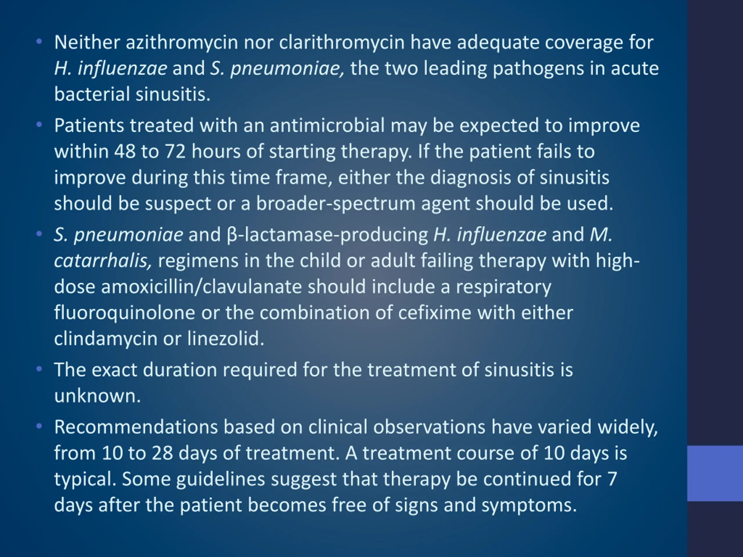 Neither azithromycin nor clarithromycin have adequate coverage for H. influenzae and S. pneumoniae, the two leading pathogens in acute bacterial sinusitis. Patients treated with an antimicrobial may be expected to improve within 48 to 72 hours of starting therapy. If the patient fails to improve during this time frame, either the diagnosis of sinusitis should be suspect or a broader-spectrum agent should be used. S. pneumoniae and -lactamase-producing H. influenzae and M. catarrhalis, regimens in the child or adult failing therapy with high- dose amoxicillin/clavulanate should include a respiratory fluoroquinolone or the combination of cefixime with either clindamycin or linezolid. The exact duration required for the treatment of sinusitis is unknown. Recommendations based on clinical observations have varied widely, from 10 to 28 days of treatment. A treatment course of 10 days is typical. Some guidelines suggest that therapy be continued for 7 days after the patient becomes free of signs and symptoms.