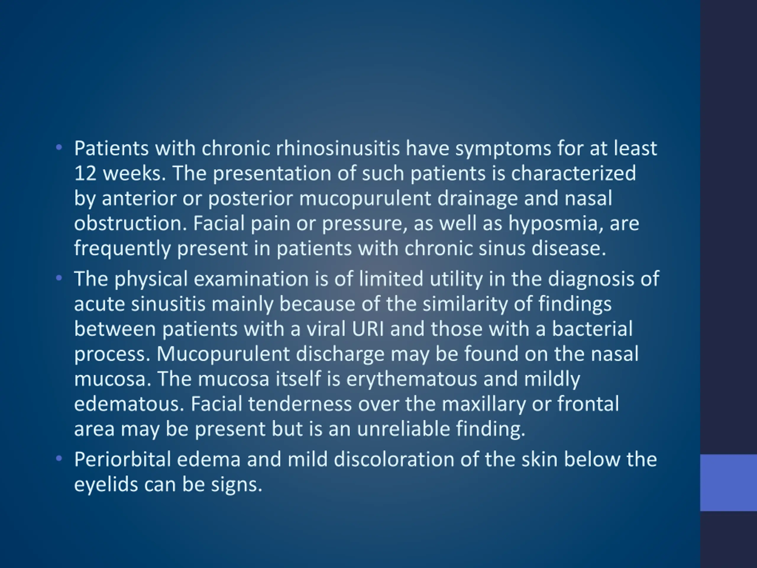 Patients with chronic rhinosinusitis have symptoms for at least 12 weeks. The presentation of such patients is characterized by anterior or posterior mucopurulent drainage and nasal obstruction. Facial pain or pressure, as well as hyposmia, are frequently present in patients with chronic sinus disease. The physical examination is of limited utility in the diagnosis of acute sinusitis mainly because of the similarity of findings between patients with a viral URI and those with a bacterial process. Mucopurulent discharge may be found on the nasal mucosa. The mucosa itself is erythematous and mildly edematous. Facial tenderness over the maxillary or frontal area may be present but is an unreliable finding. Periorbital edema and mild discoloration of the skin below the eyelids can be signs.