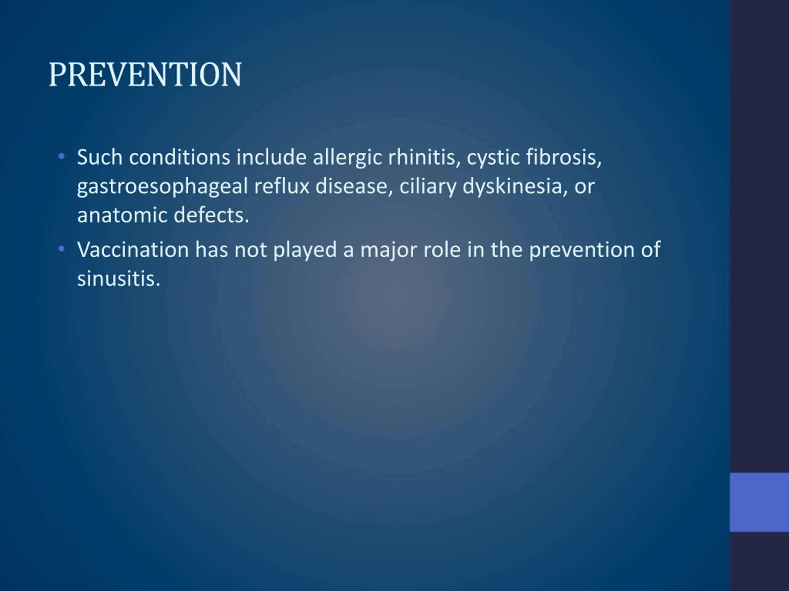 PREVENTION Such conditions include allergic rhinitis, cystic fibrosis, gastroesophageal reflux disease, ciliary dyskinesia, or anatomic defects. Vaccination has not played a major role in the prevention of sinusitis.