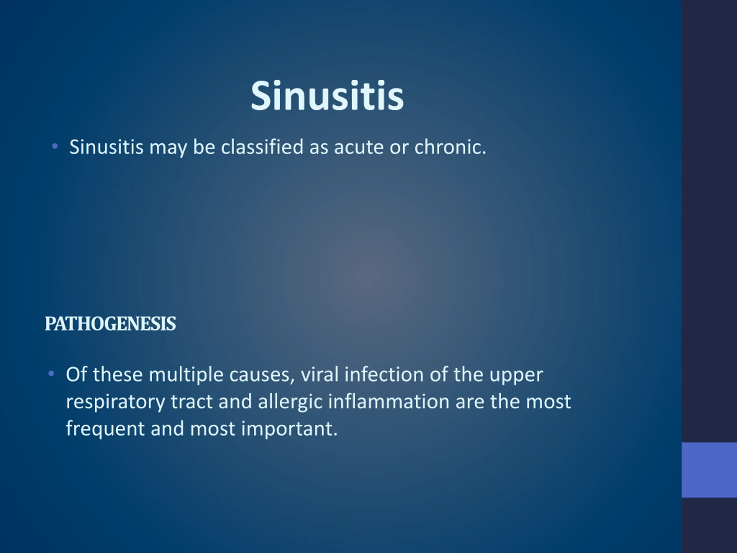 Sinusitis Sinusitis may be classified as acute or chronic. PATHOGENESIS Of these multiple causes, viral infection of the upper respiratory tract and allergic inflammation are the most frequent and most important.