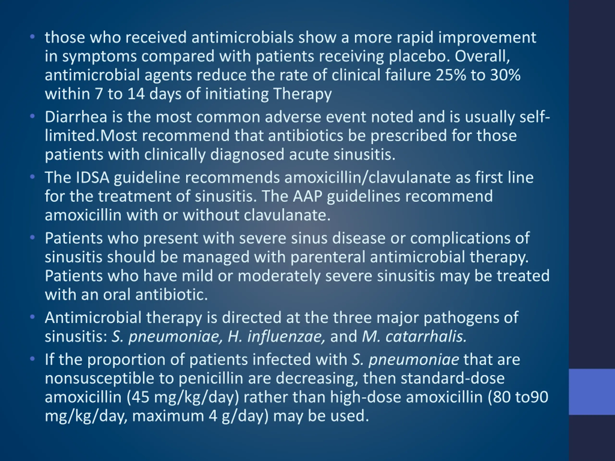 those who received antimicrobials show a more rapid improvement in symptoms compared with patients receiving placebo. Overall, antimicrobial agents reduce the rate of clinical failure 25% to 30% within 7 to 14 days of initiating Therapy Diarrhea is the most common adverse event noted and is usually self- limited.Most recommend that antibiotics be prescribed for those patients with clinically diagnosed acute sinusitis. The IDSA guideline recommends amoxicillin/clavulanate as first line for the treatment of sinusitis. The AAP guidelines recommend amoxicillin with or without clavulanate. Patients who present with severe sinus disease or complications of sinusitis should be managed with parenteral antimicrobial therapy. Patients who have mild or moderately severe sinusitis may be treated with an oral antibiotic. Antimicrobial therapy is directed at the three major pathogens of sinusitis: S. pneumoniae, H. influenzae, and M. catarrhalis. If the proportion of patients infected with S. pneumoniae that are nonsusceptible to penicillin are decreasing, then standard-dose amoxicillin (45 mg/kg/day) rather than high-dose amoxicillin (80 to90 mg/kg/day, maximum 4 g/day) may be used.