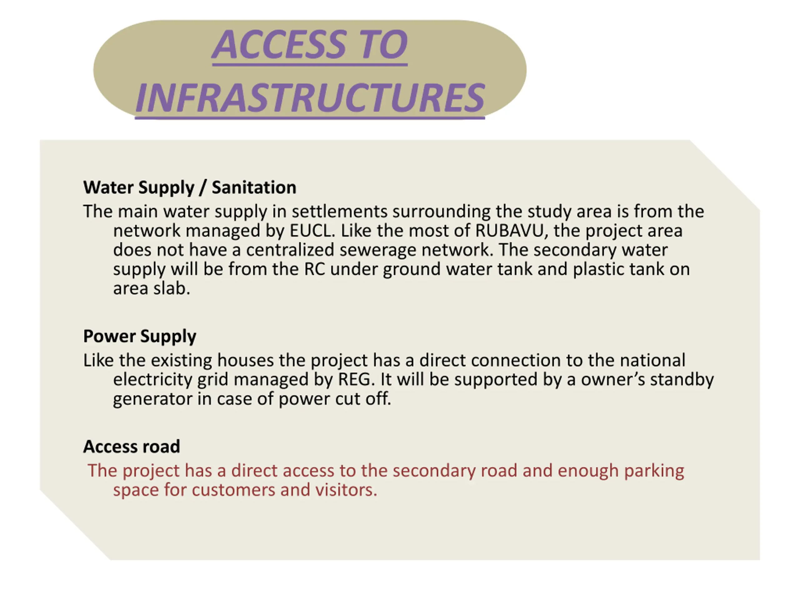 ACCESS TO INFRASTRUCTURES Water Supply / Sanitation The main water supply in settlements surrounding the study area is from the network managed by EUCL. Like the most of RUBAVU, the project area does not have a centralized sewerage network. The secondary water supply will be from the RC under ground water tank and plastic tank on area slab. Power Supply Like the existing houses the project has a direct connection to the national electricity grid managed by REG. It will be supported by a owner s standby generator in case of power cut off. Access road The project has a direct access to the secondary road and enough parking space for customers and visitors.