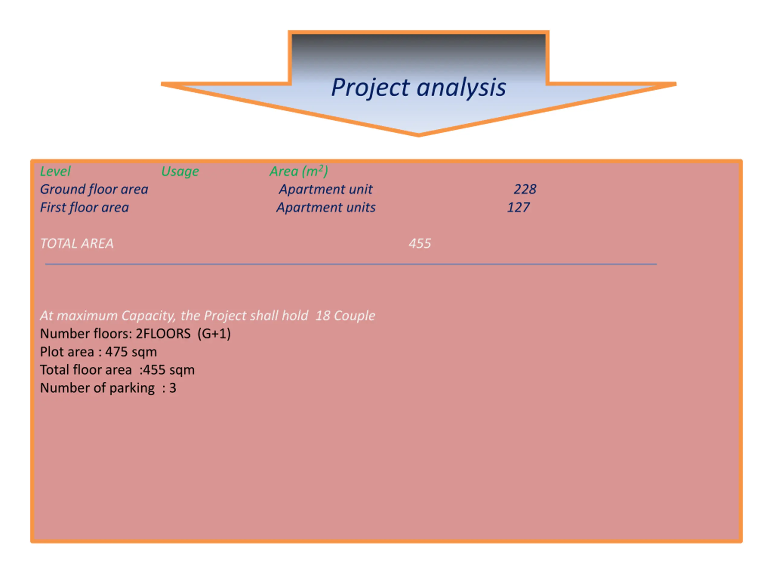 Project analysis Level Usage Area (m2) Ground floor area Apartment unit 228 First floor area Apartment units 127 TOTAL AREA 455 At maximum Capacity, the Project shall hold 18 Couple Number floors: 2FLOORS (G+1) Plot area : 475 sqm Total floor area :455 sqm Number of parking : 3