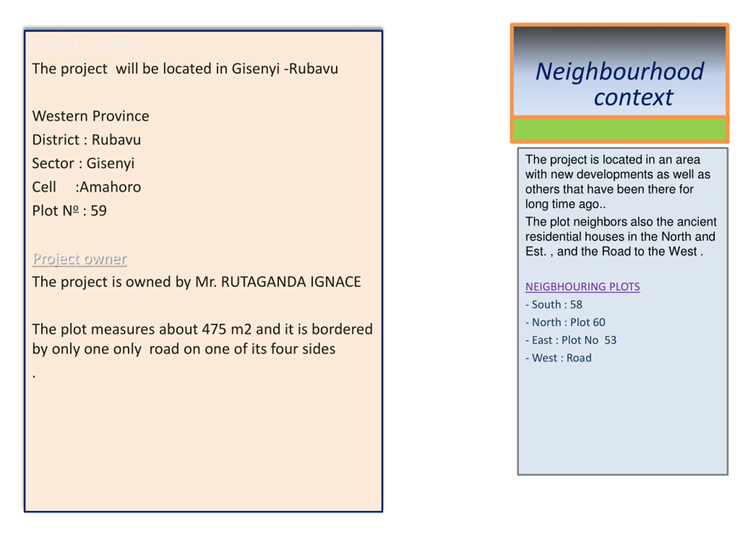 Project Location The project will be located in Gisenyi -Rubavu Neighbourhood context Western Province District : Rubavu Sector : Gisenyi Cell :Amahoro Plot No : 59 The project is located in an area with new developments as well as others that have been there for long time ago.. The plot neighbors also the ancient residential houses in the North and Est. , and the Road to the West . Project owner The project is owned by Mr. RUTAGANDA IGNACE NEIGBHOURING PLOTS - South : 58 - North : Plot 60 - East : Plot No 53 - West : Road The plot measures about 475 m2 and it is bordered by only one only road on one of its four sides . .