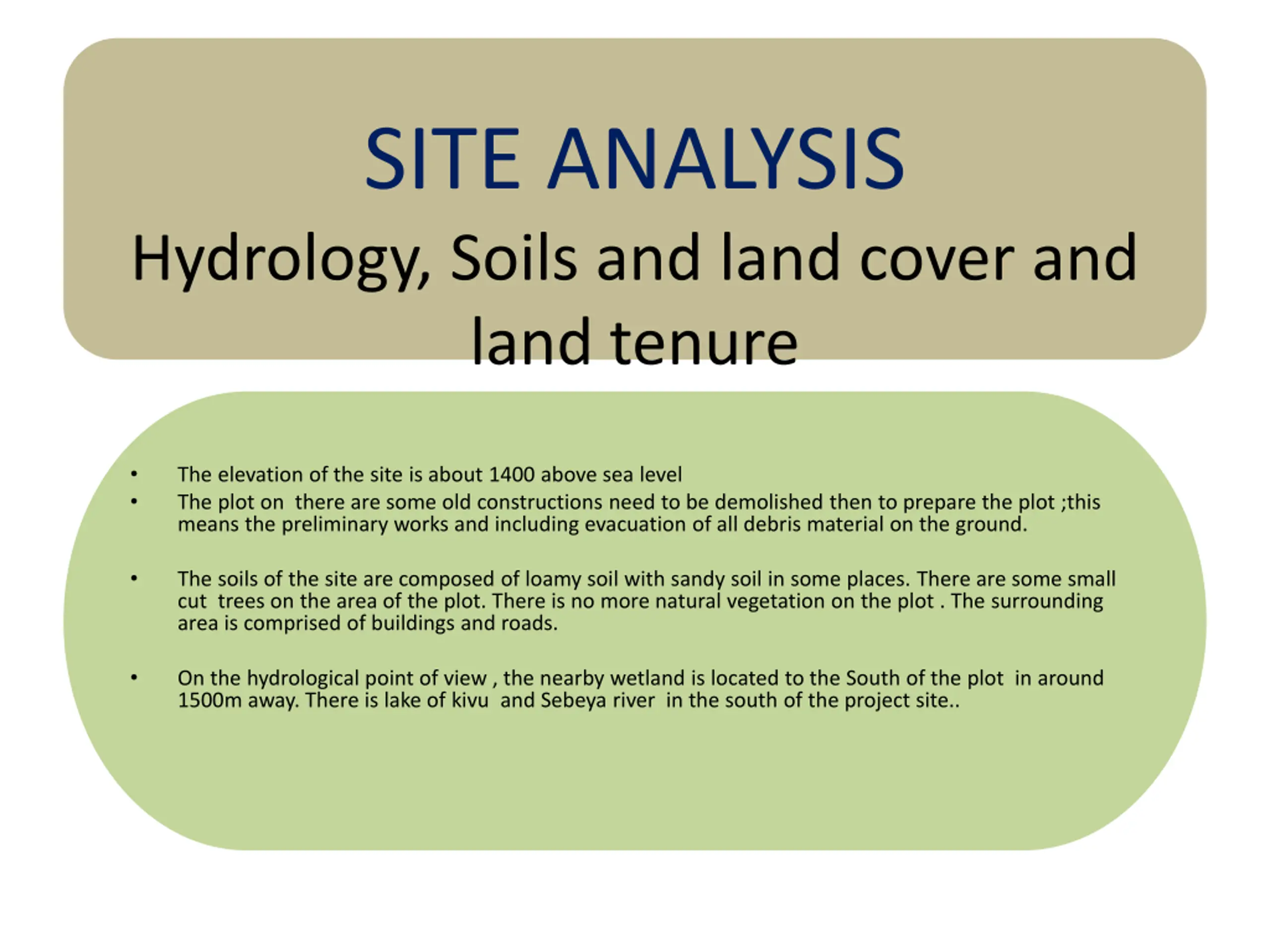 SITE ANALYSIS Hydrology, Soils and land cover and land tenure The elevation of the site is about 1400 above sea level The plot on there are some old constructions need to be demolished then to prepare the plot ;this means the preliminary works and including evacuation of all debris material on the ground. The soils of the site are composed of loamy soil with sandy soil in some places. There are some small cut trees on the area of the plot. There is no more natural vegetation on the plot . The surrounding area is comprised of buildings and roads. On the hydrological point of view , the nearby wetland is located to the South of the plot in around 1500m away. There is lake of kivu and Sebeya river in the south of the project site..