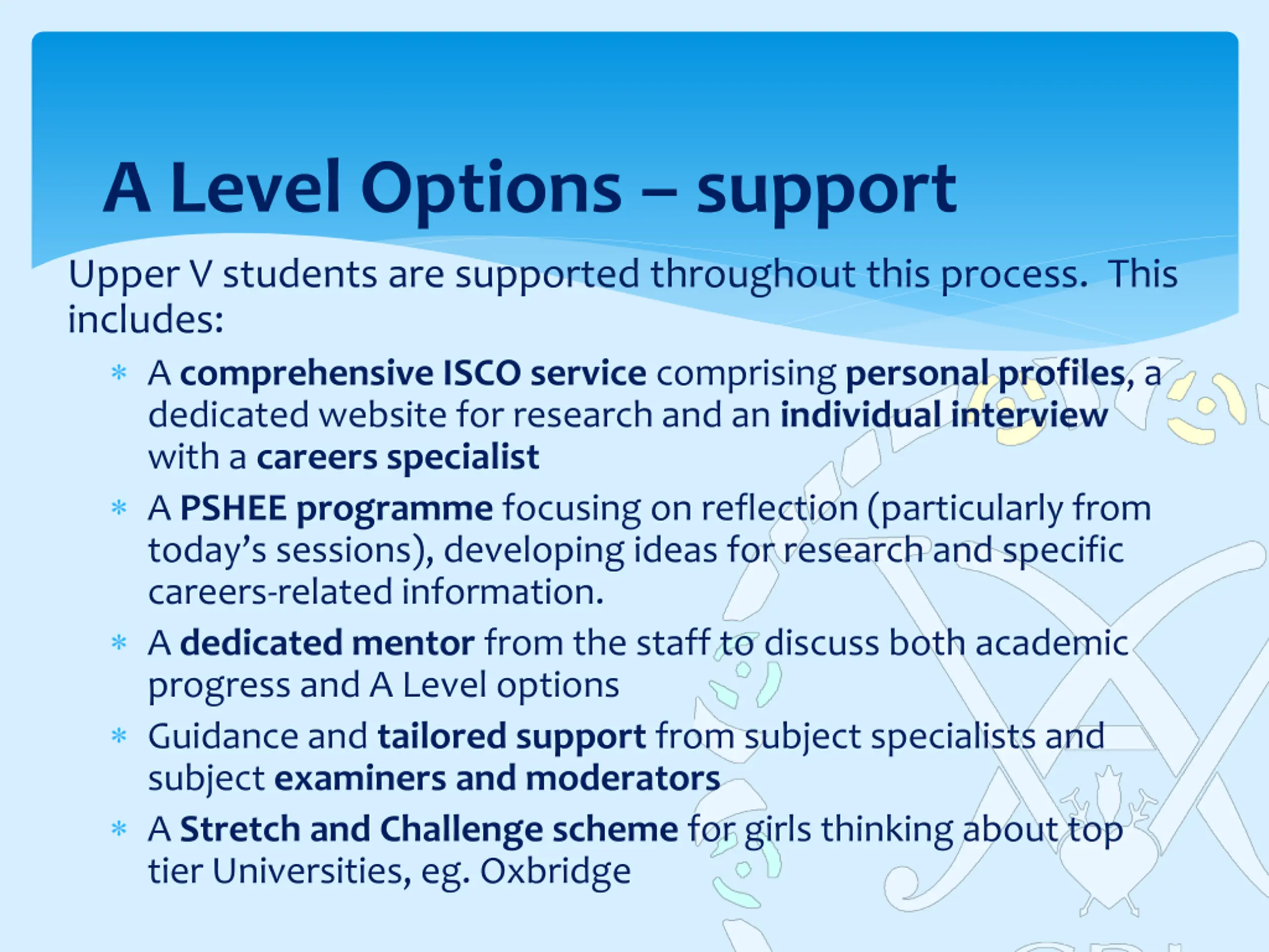 A Level Options support Upper V students are supported throughout this process. This includes: A comprehensive ISCO service comprising personal profiles, a dedicated website for research and an individual interview with a careers specialist A PSHEE programme focusing on reflection (particularly from today s sessions), developing ideas for research and specific careers-related information. A dedicated mentor from the staff to discuss both academic progress and A Level options Guidance and tailored support from subject specialists and subject examiners and moderators A Stretch and Challenge scheme for girls thinking about top tier Universities, eg. Oxbridge