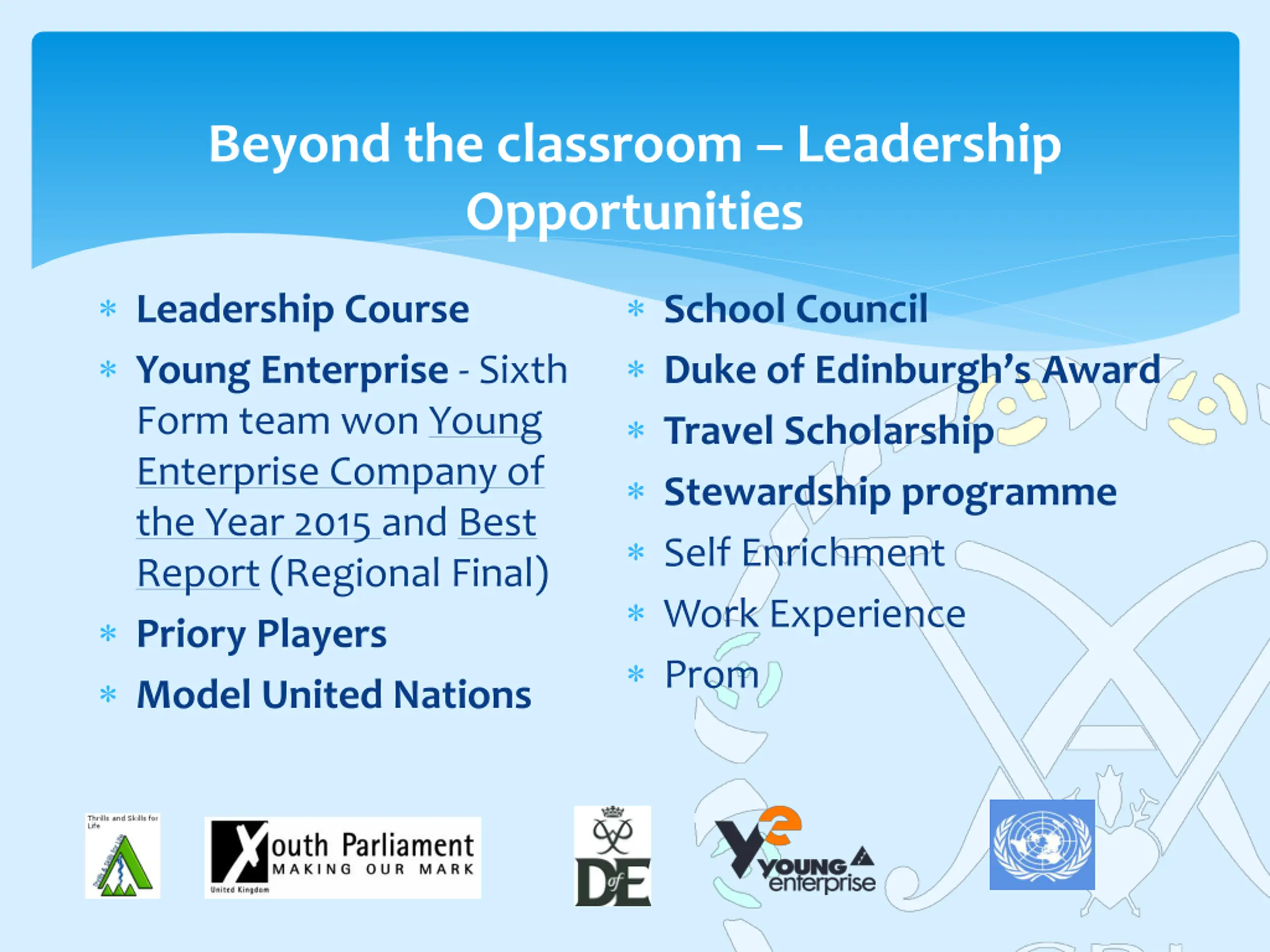 Beyond the classroom Leadership Opportunities Leadership Course Young Enterprise - Sixth Form team won Young Enterprise Company of the Year 2015 and Best Report (Regional Final) Priory Players Model United Nations School Council Duke of Edinburgh s Award Travel Scholarship Stewardship programme Self Enrichment Work Experience Prom