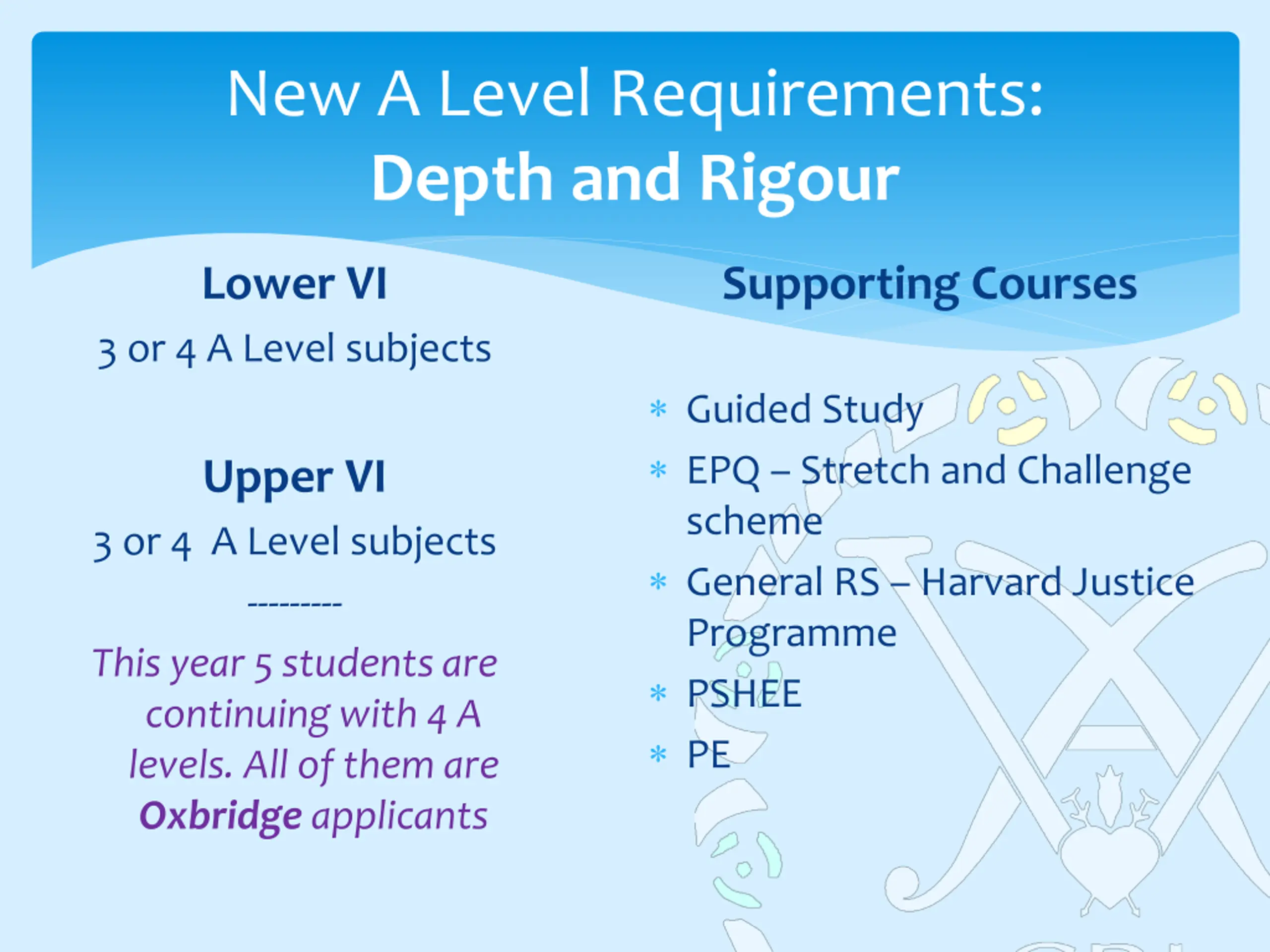 New A Level Requirements: Depth and Rigour Lower VI Supporting Courses 3 or 4 A Level subjects Guided Study EPQ Stretch and Challenge scheme General RS Harvard Justice Programme PSHEE PE Upper VI 3 or 4 A Level subjects --------- This year 5 students are continuing with 4 A levels. All of them are Oxbridge applicants