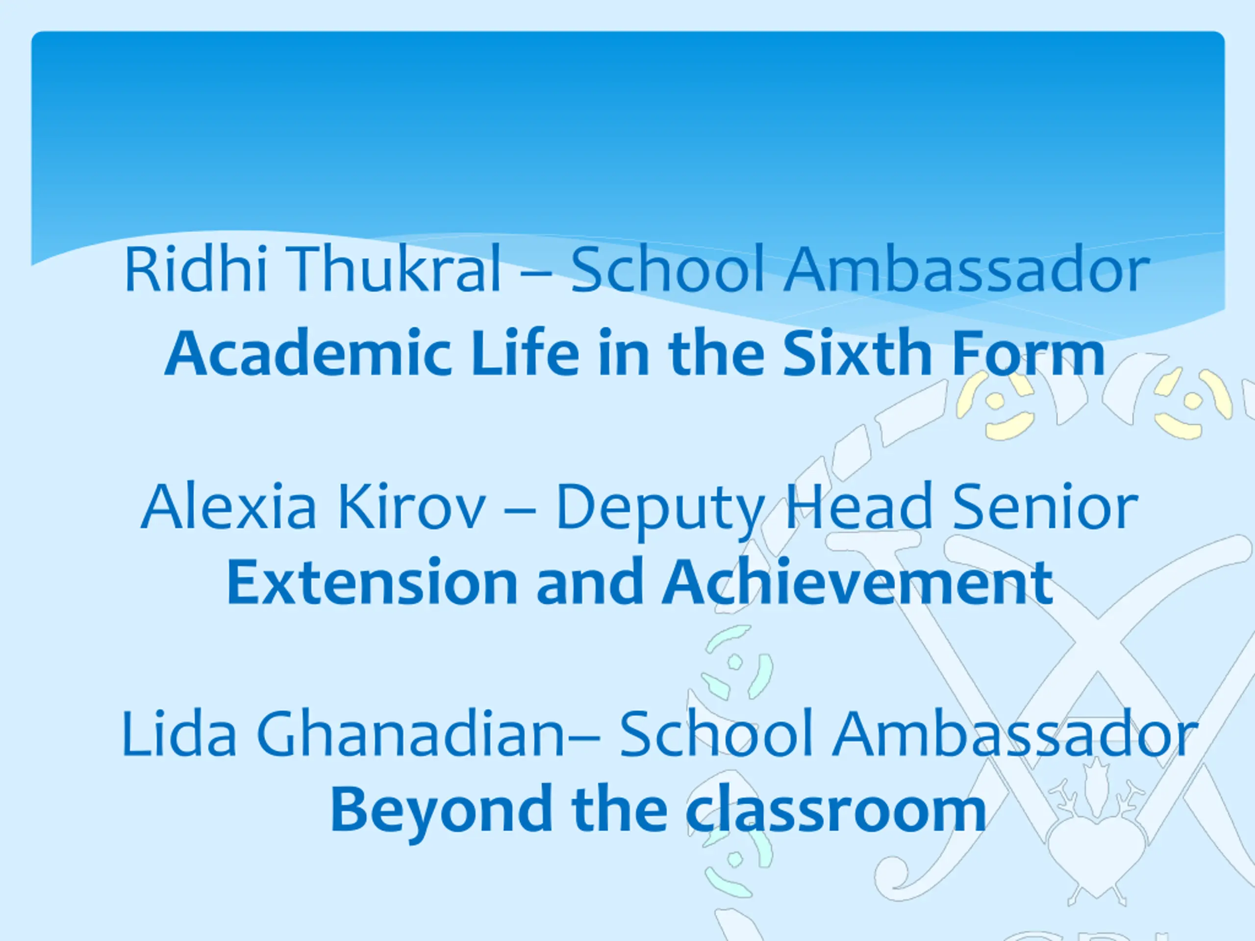 Ridhi Thukral School Ambassador Academic Life in the Sixth Form Alexia Kirov Deputy Head Senior Extension and Achievement Lida Ghanadian School Ambassador Beyond the classroom