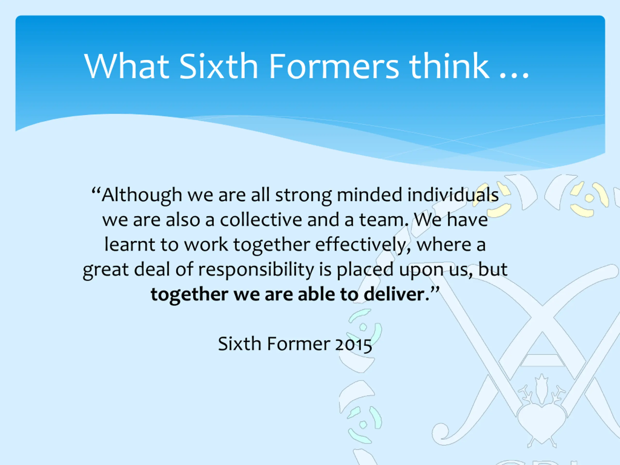 What Sixth Formers think Although we are all strong minded individuals we are also a collective and a team. We have learnt to work together effectively, where a great deal of responsibility is placed upon us, but together we are able to deliver. Sixth Former 2015