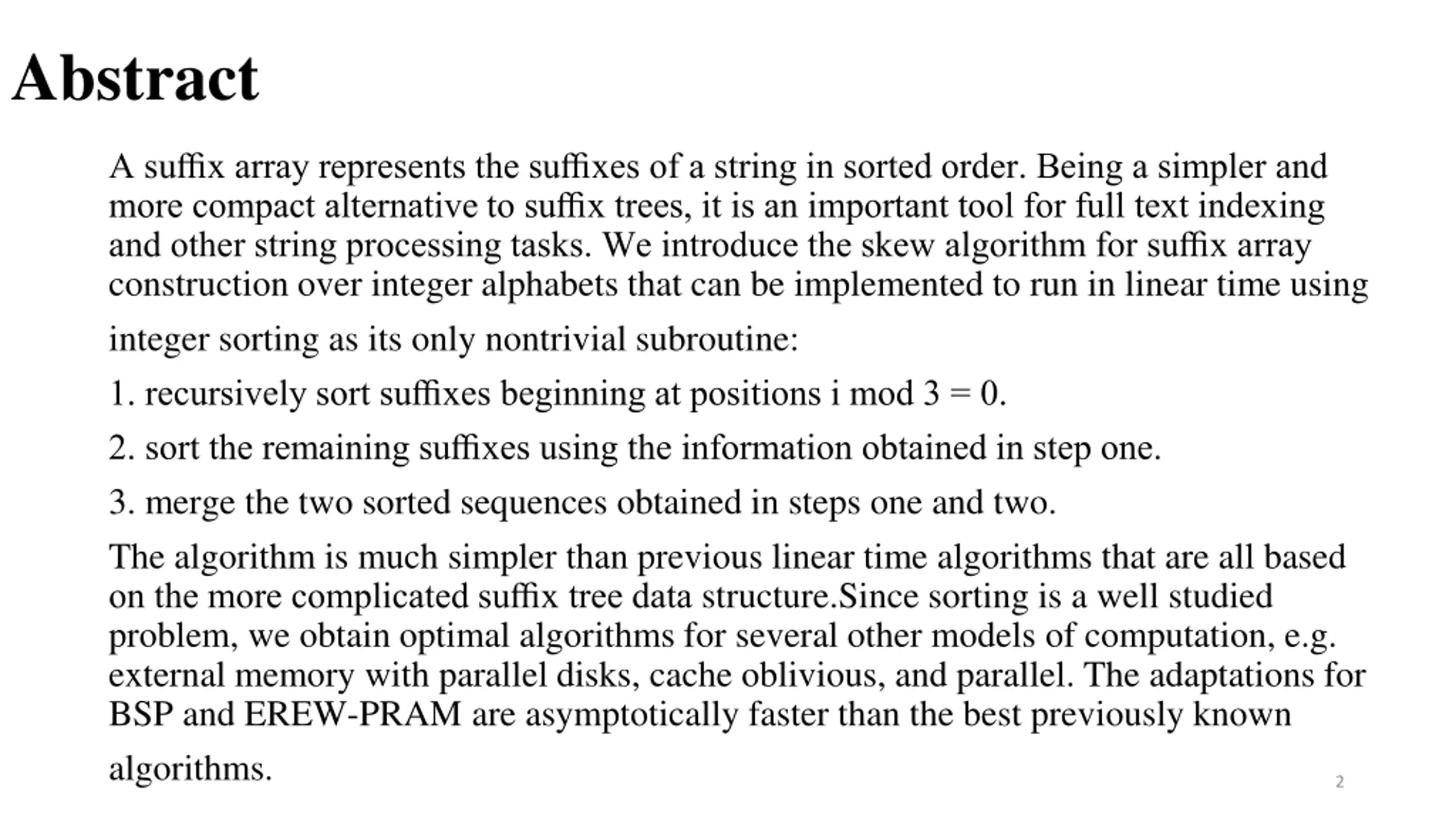 Abstract A suffix array represents the suffixes of a string in sorted order. Being a simpler and more compact alternative to suffix trees, it is an important tool for full text indexing and other string processing tasks. We introduce the skew algorithm for suffix array construction over integer alphabets that can be implemented to run in linear time using integer sorting as its only nontrivial subroutine: 1. recursively sort suffixes beginning at positions i mod 3 = 0. 2. sort the remaining suffixes using the information obtained in step one. 3. merge the two sorted sequences obtained in steps one and two. The algorithm is much simpler than previous linear time algorithms that are all based on the more complicated suffix tree data structure.Since sorting is a well studied problem, we obtain optimal algorithms for several other models of computation, e.g. external memory with parallel disks, cache oblivious, and parallel. The adaptations for BSP and EREW-PRAM are asymptotically faster than the best previously known algorithms. 2