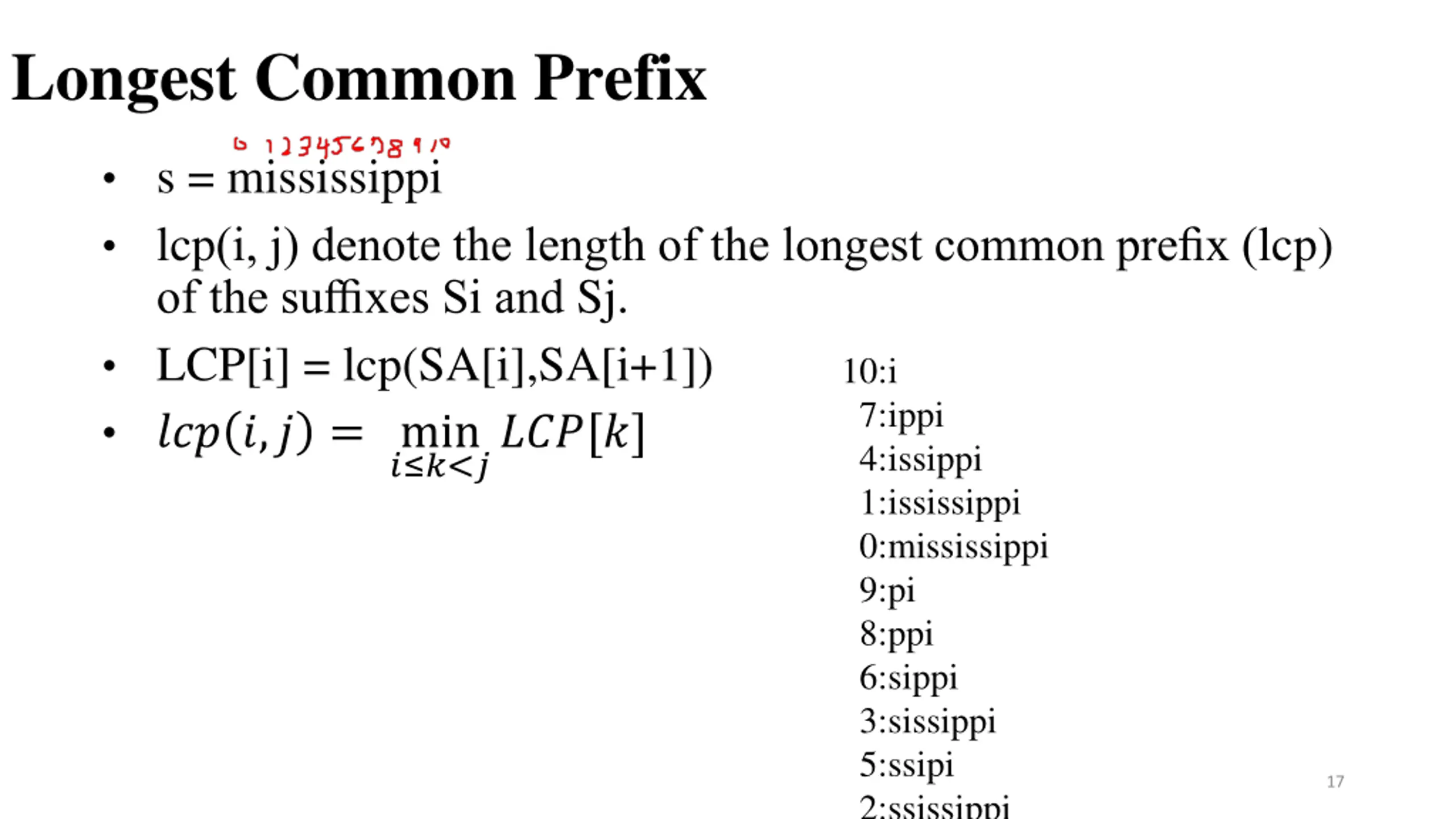 Longest Common Prefix s = mississippi lcp(i, j) denote the length of the longest common prefix (lcp) of the suffixes Si and Sj. LCP[i] = lcp(SA[i],SA[i+1]) ??? ?,? = min ? ?<????[?] 10:i 7:ippi 4:issippi 1:ississippi 0:mississippi 9:pi 8:ppi 6:sippi 3:sissippi 5:ssipi 2:ssissippi 17