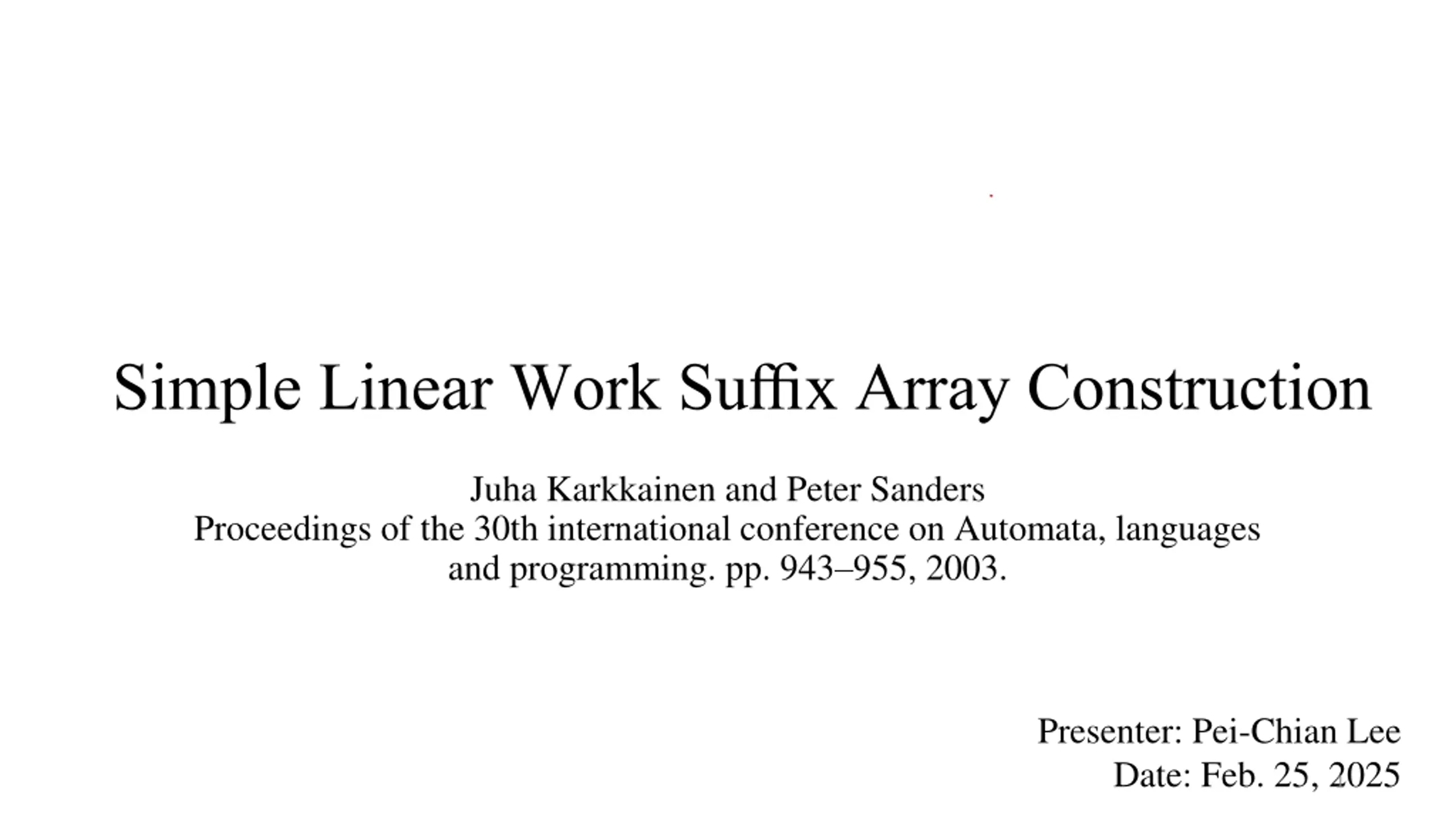 Simple Linear Work Suffix Array Construction Juha Karkkainen and Peter Sanders Proceedings of the 30th international conference on Automata, languages and programming. pp. 943 955, 2003. Presenter: Pei-Chian Lee Date: Feb. 25, 2025 1