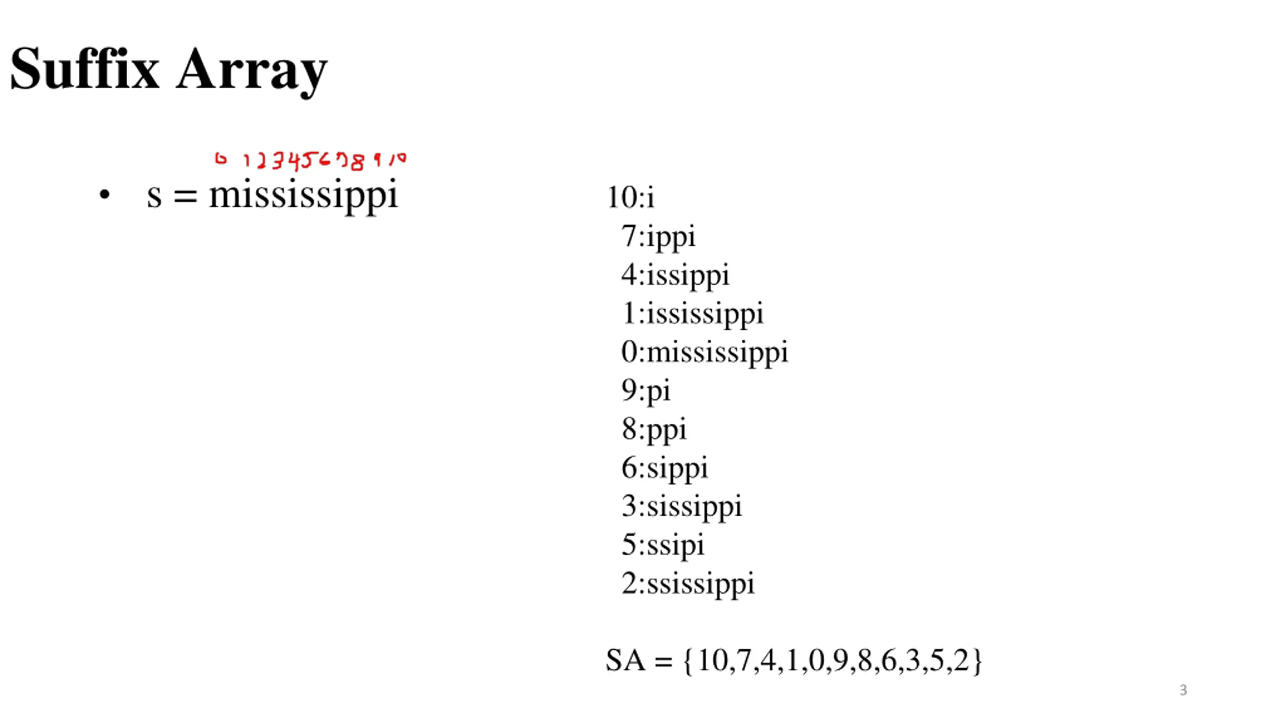 Suffix Array s = mississippi 10:i 7:ippi 4:issippi 1:ississippi 0:mississippi 9:pi 8:ppi 6:sippi 3:sissippi 5:ssipi 2:ssissippi SA = {10,7,4,1,0,9,8,6,3,5,2} 3