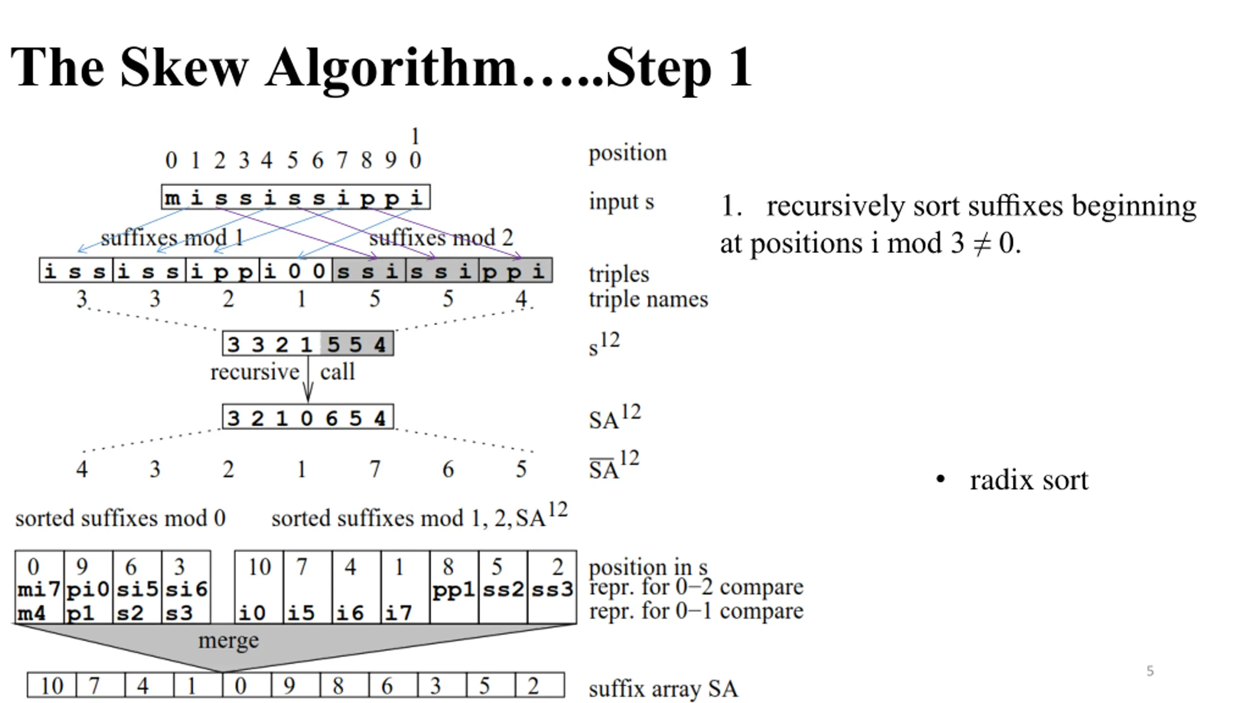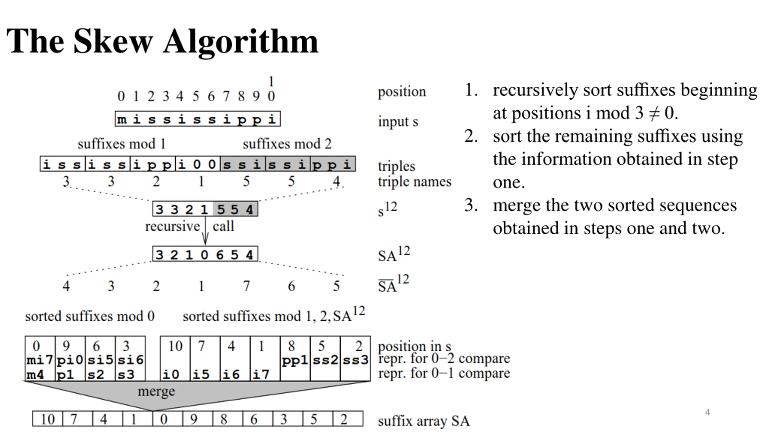 The Skew Algorithm 1. recursively sort suffixes beginning at positions i mod 3 0. 2. sort the remaining suffixes using the information obtained in step one. 3. merge the two sorted sequences obtained in steps one and two. 4