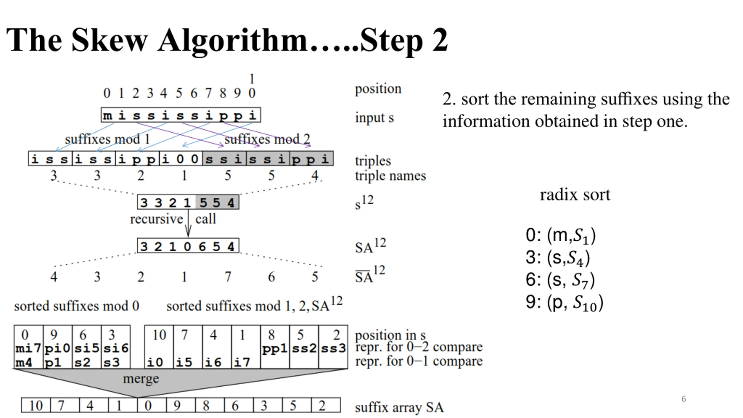The Skew Algorithm..Step 2 2. sort the remaining suffixes using the information obtained in step one. radix sort 0: (m,?1) 3: (s,?4) 6: (s, ?7) 9: (p, ?10) 6