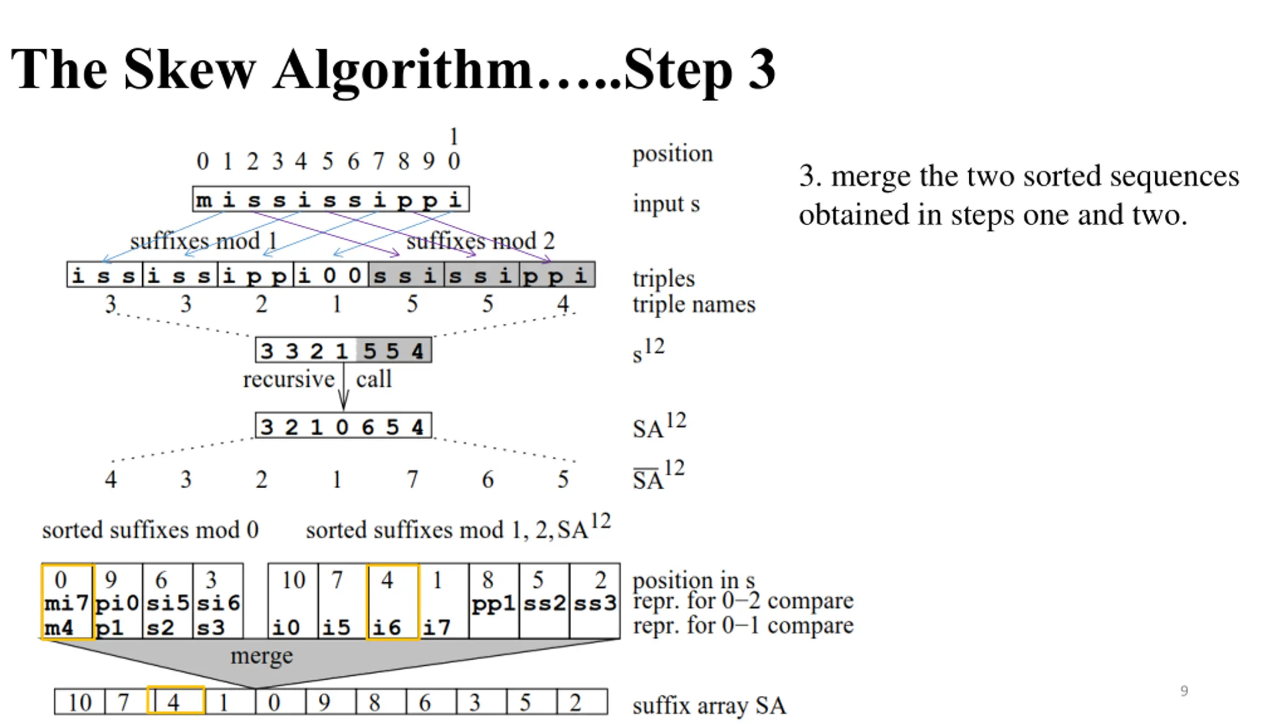 The Skew Algorithm..Step 3 3. merge the two sorted sequences obtained in steps one and two. 8