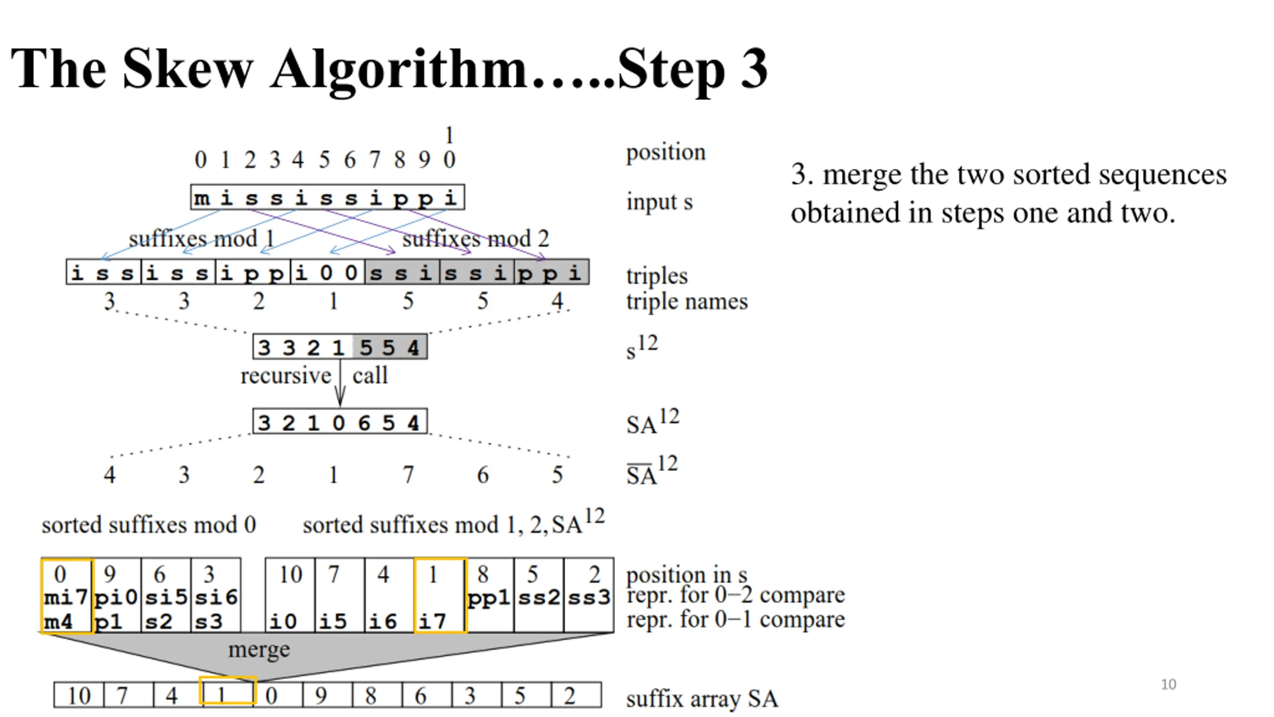 The Skew Algorithm..Step 3 3. merge the two sorted sequences obtained in steps one and two. 9
