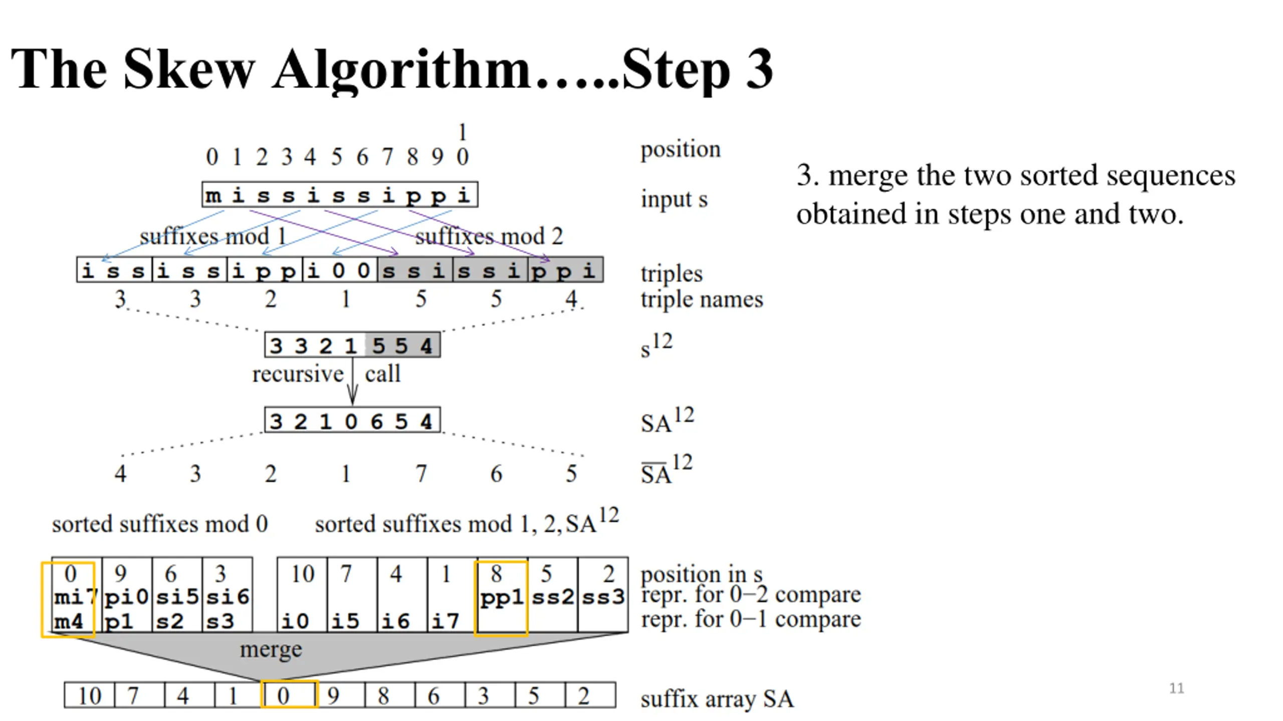The Skew Algorithm..Step 3 3. merge the two sorted sequences obtained in steps one and two. 10