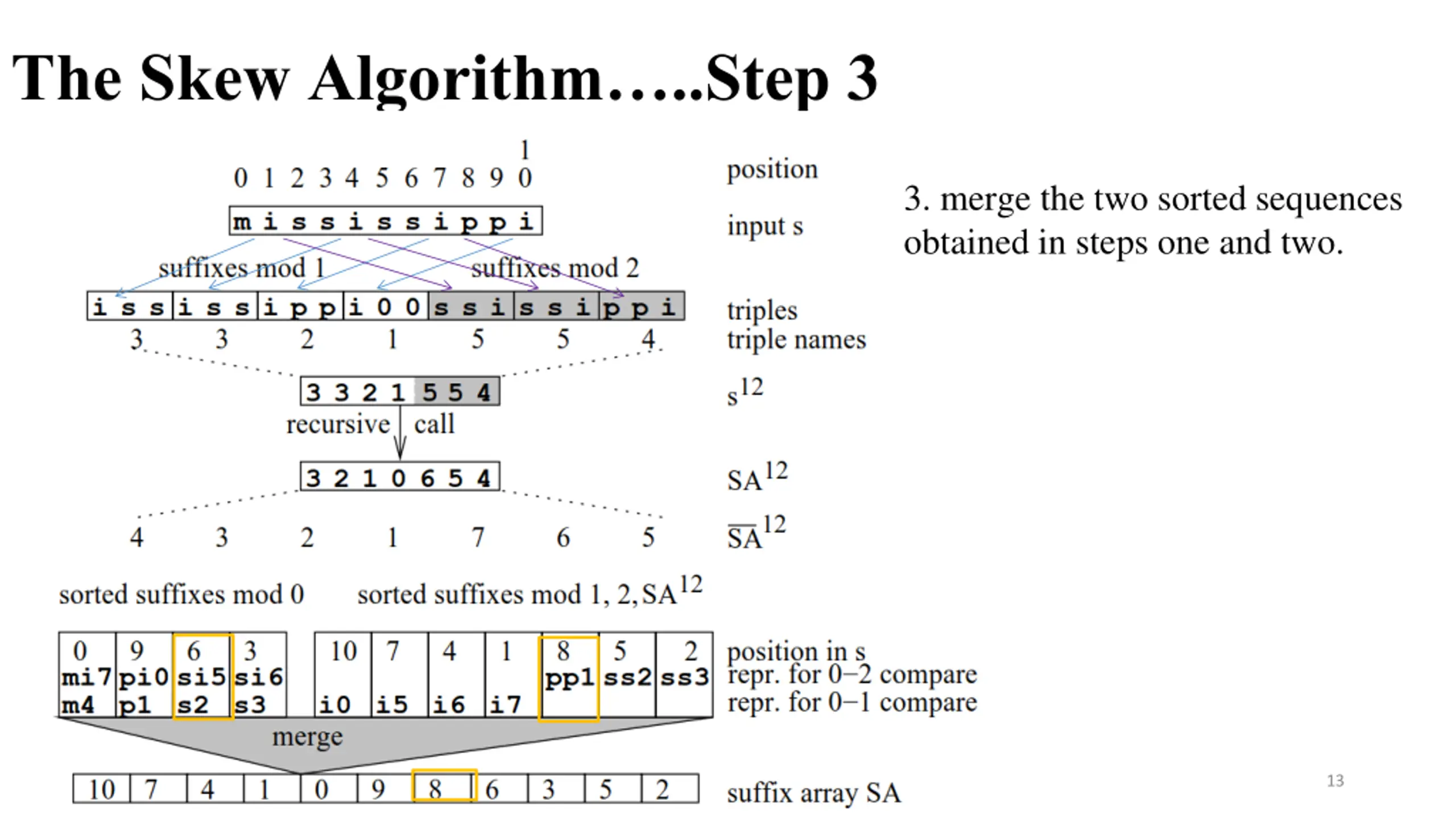 The Skew Algorithm..Step 3 3. merge the two sorted sequences obtained in steps one and two. 12