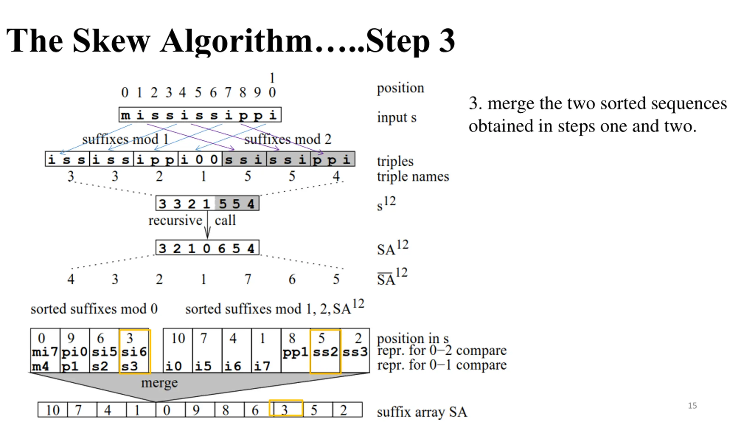 The Skew Algorithm..Step 3 3. merge the two sorted sequences obtained in steps one and two. 14